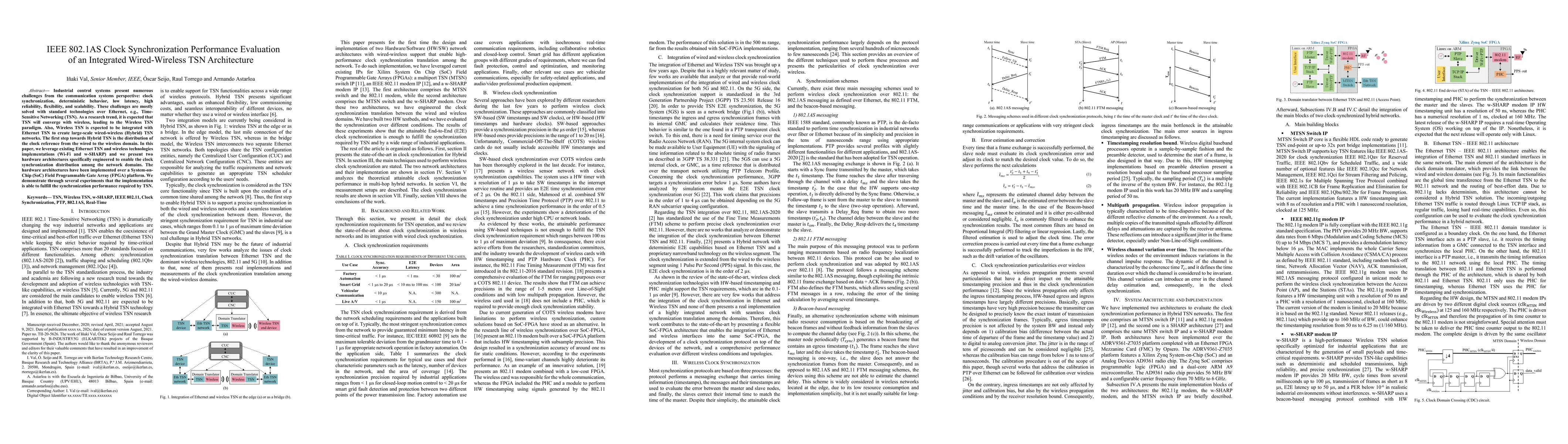 This paper evaluates the performance of clock synchronization in an integrated wired-wireless TSN architecture, demonstrating two FPGA-based hardware architectures that successfully distribute clock references across domains, meeting TSN synchronization requirements.