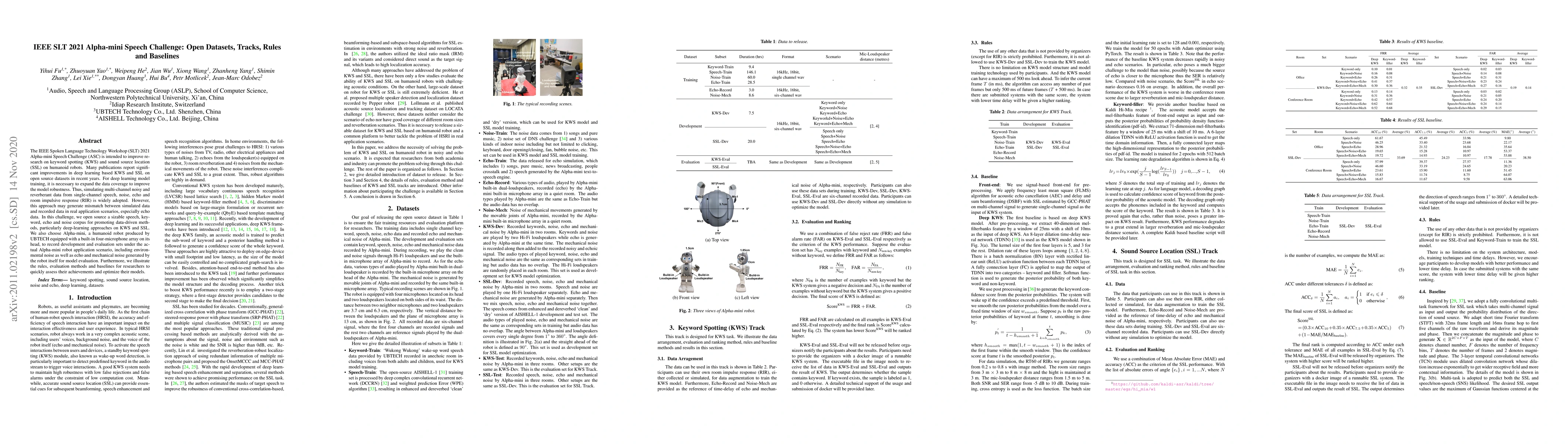 The IEEE SLT 2021 Alpha-mini Speech Challenge provides open-source datasets for keyword spotting and sound source location on humanoid robots, aiming to improve deep learning model robustness.