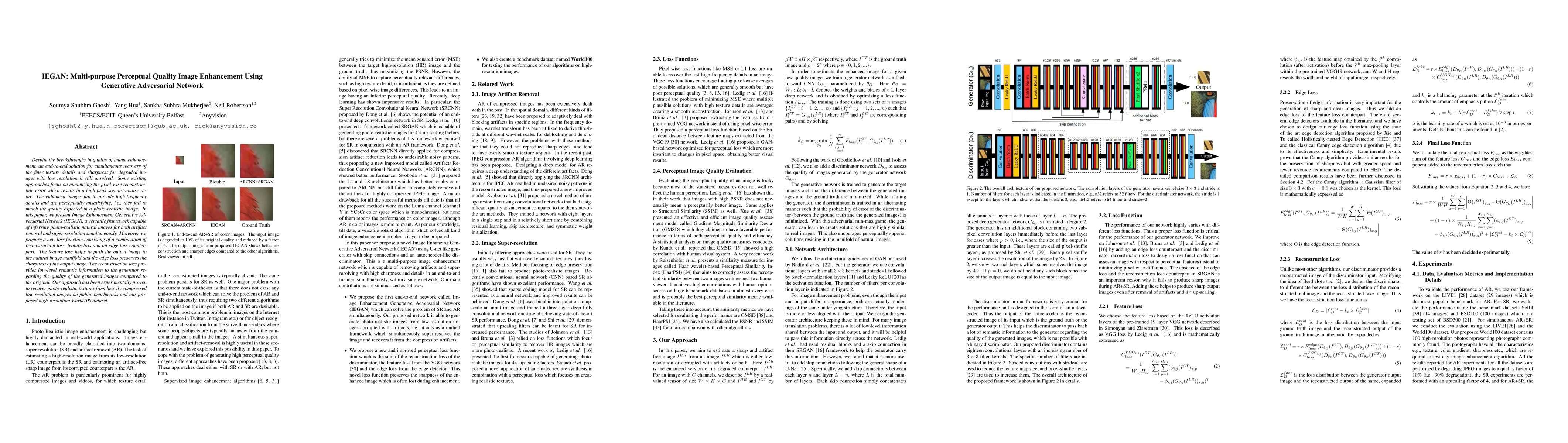 IEGAN is a versatile framework that enhances image quality by simultaneously removing artifacts and super-resolving low-resolution images. It employs a novel loss function combining reconstruction, feature, and edge losses to generate photo-realistic images with preserved sharpness and fine details.