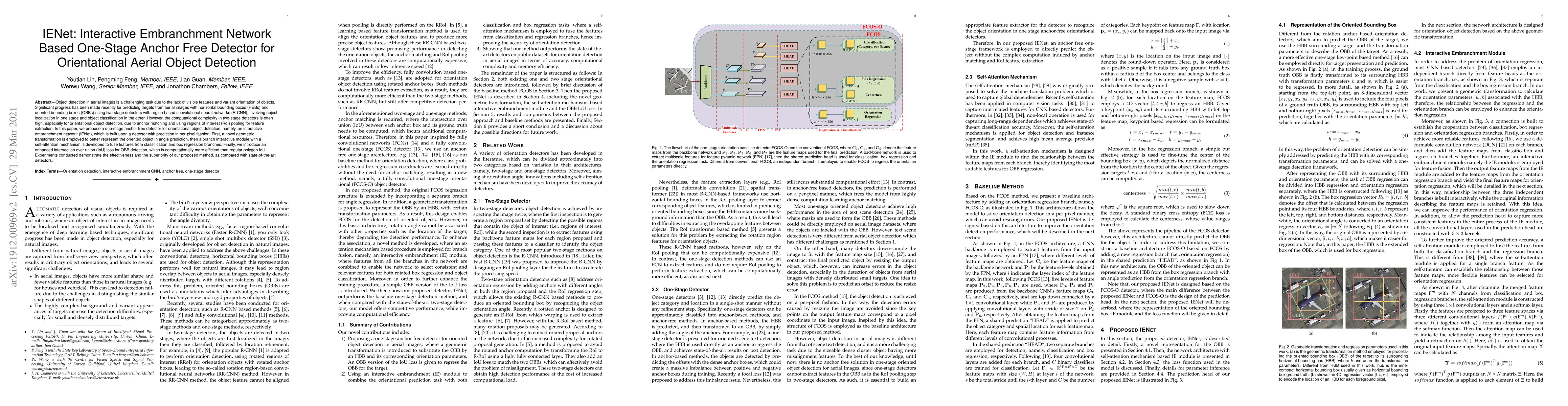 The IENet is a one-stage, anchor-free detector designed for orientational object detection in aerial images, employing a novel geometric transformation and a branch interactive module with self-attention for feature fusion, and an enhanced IoU loss for efficient oriented bounding box detection. Experiments show it outperforms state-of-the-art methods.