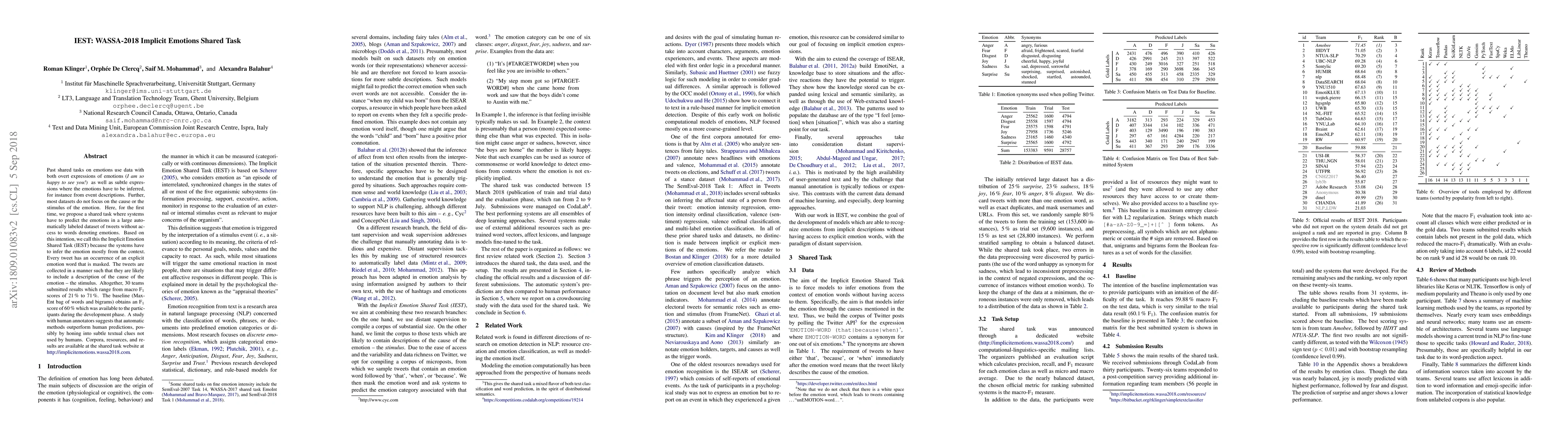 The IEST: WASSA-2018 Implicit Emotions Shared Task challenges systems to infer emotions from context in tweets without explicit emotion words, focusing on the underlying stimulus. Results from 30 teams ranged from 21% to 71% macro F1 score, with automatic methods outperforming human predictions.