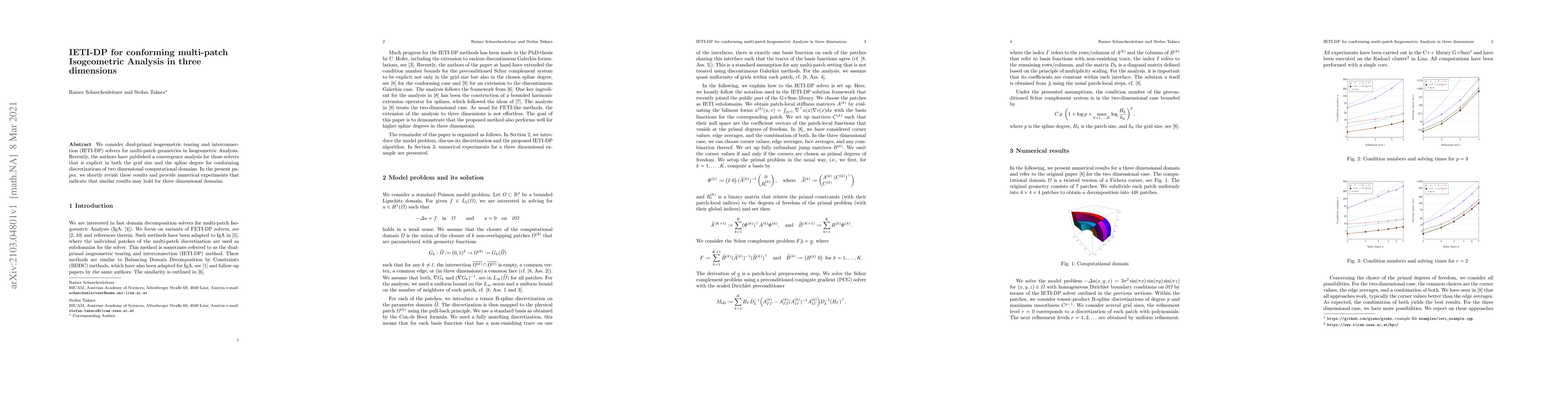 We consider dual-primal isogeometric tearing and interconnection (IETI-DP) solvers for multi-patch geometries in Isogeometric Analysis. Recently, the authors have published a convergence analysis for those solvers that is explicit in both the grid size and the spline degree for conforming discretizations of two dimensional computational domains. In the present paper, we shortly revisit these results and provide numerical experiments that indicate that similar results may hold for three dimensional domains.
