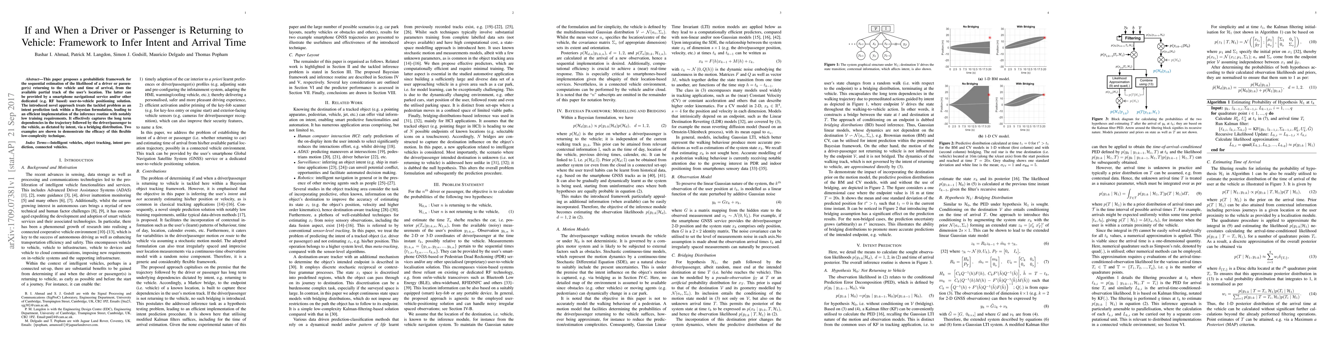 This paper proposes a probabilistic framework for the sequential estimation of the likelihood of a driver or passenger(s) returning to the vehicle and time of arrival, from the available partial track of the user location. The latter can be provided by a smartphone navigational service and/or other dedicated (e.g. RF based) user-to-vehicle positioning solution. The introduced novel approach treats the tackled problem as an intent prediction task within a Bayesian formulation, leading to an efficient implementation of the inference routine with notably low training requirements. It effectively captures the long term dependencies in the trajectory followed by the driver/passenger to the vehicle, as dictated by intent, via a bridging distribution. Two examples are shown to demonstrate the efficacy of this flexible low-complexity technique.