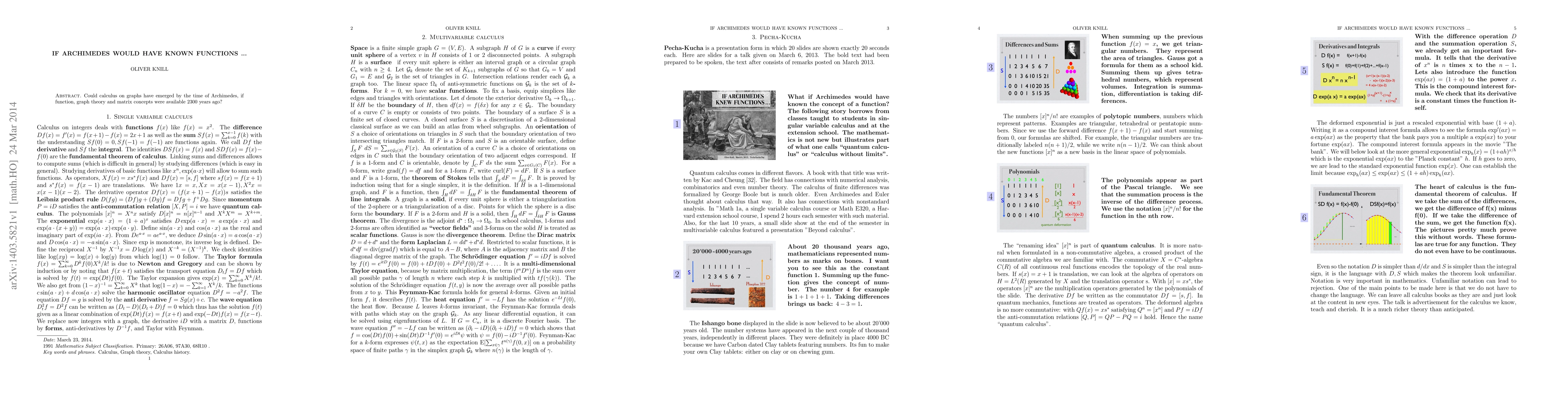 These are notes and slides from a Pecha-Kucha talk given on March 6, 2013. The presentation tinkered with the question whether calculus on graphs could have emerged by the time of Archimedes, if the concept of a function would have been available 2300 years ago. The text first attempts to boil down discrete single and multivariable calculus to one page each, then presents the slides with additional remarks and finally includes 40 "calculus problems" in a discrete or so-called 'quantum calculus' setting. We also added some sample Mathematica code, gave a short overview over the emergence of the function concept in calculus and included comments on the development of calculus textbooks over time.