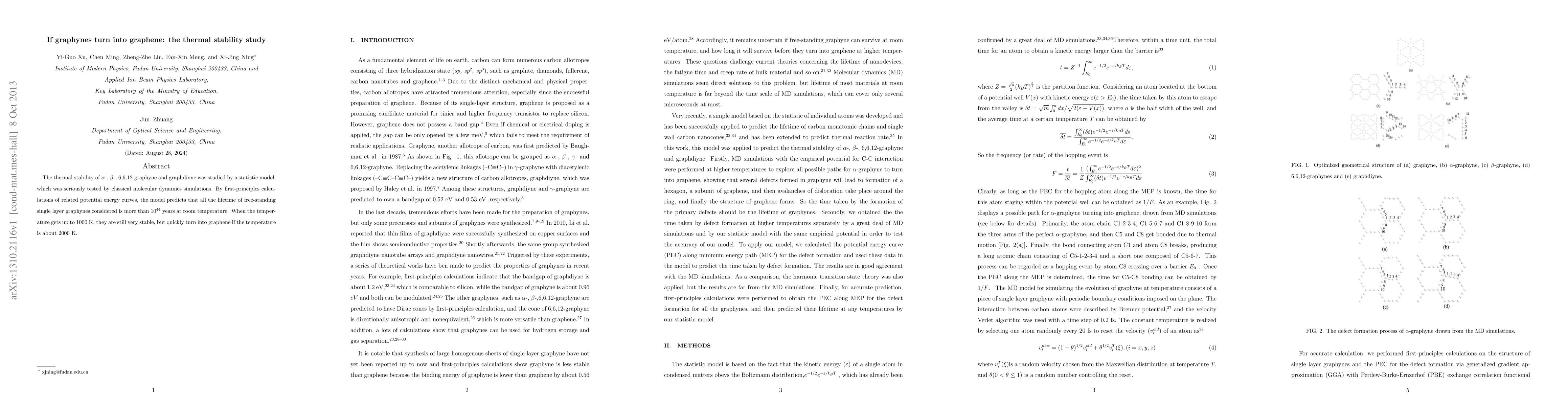The thermal stability of $\alpha$-, $\beta$-, 6,6,12-graphyne and graphdiyne was studied by a statistic model, which was seriously tested by classical molecular dynamics simulations. By first-principles calculations of related potential energy curves, the model predicts that all the lifetime of free-standing single layer graphynes considered is more than 10$^{44}$ years at room temperature. When the temperature gets up to 1000 K, they are still very stable, but quickly turn into graphene if the temperature is about 2000 K