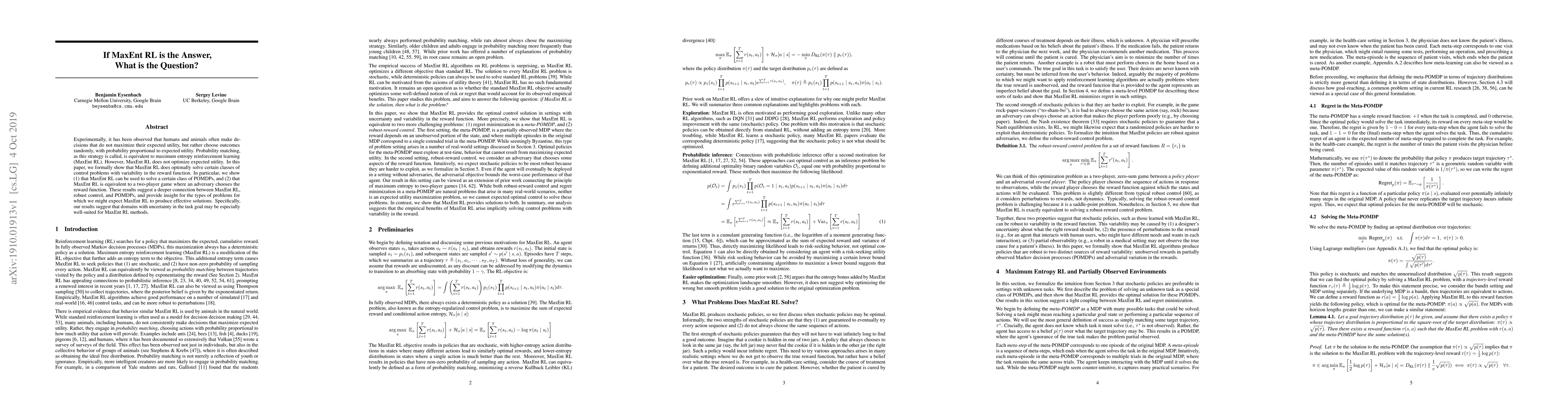 This paper demonstrates that MaxEnt RL optimally solves control problems with variable reward functions, particularly in partially observable Markov decision processes (POMDPs), and is equivalent to a two-player game where an adversary sets the reward. It suggests that MaxEnt RL is effective in domains with uncertainty in task goals.