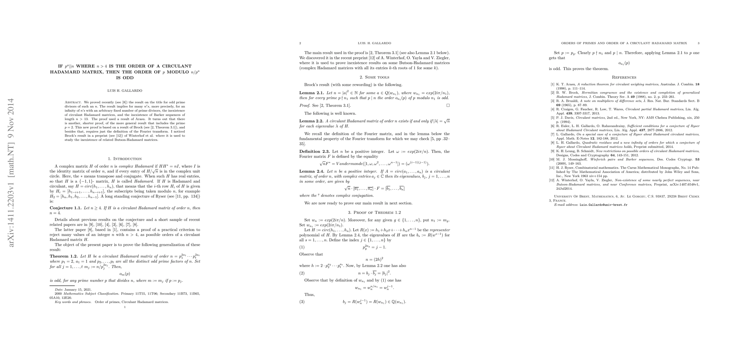 This paper presents a new, simpler proof for a previously established result concerning the non-existence of circulant Hadamard matrices of certain orders. The proof leverages Brock's theorem, making it more inclusive as it covers the prime number 2. This has implications for the non-existence of Barker sequences of lengths greater than 13 and is also relevant to the study of Butson-Hadamard matrices.