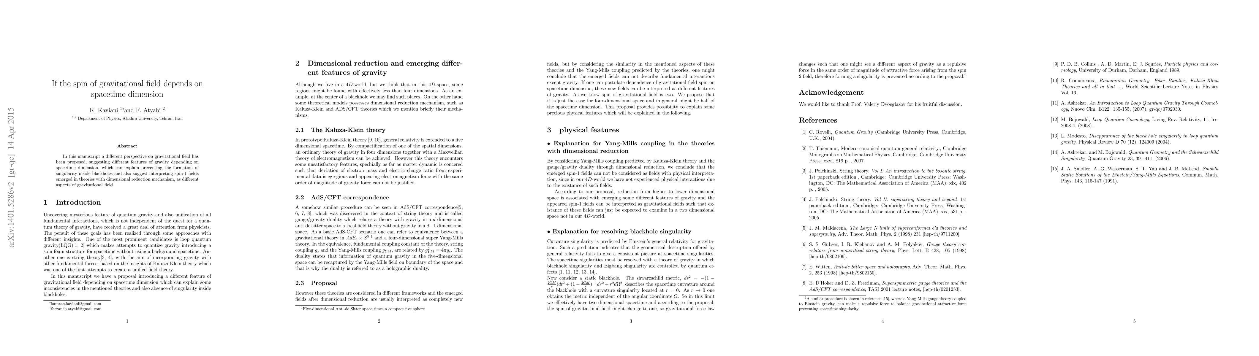 In this manuscript a different perspective on gravitational field has been proposed, suggesting different features of gravity depending on spacetime dimension, which can explain preventing the formation of singularity inside blackholes and also suggest interpreting spin-1 fields emerged in theories with dimensional reduction mechanism, as different aspects of gravitational field.