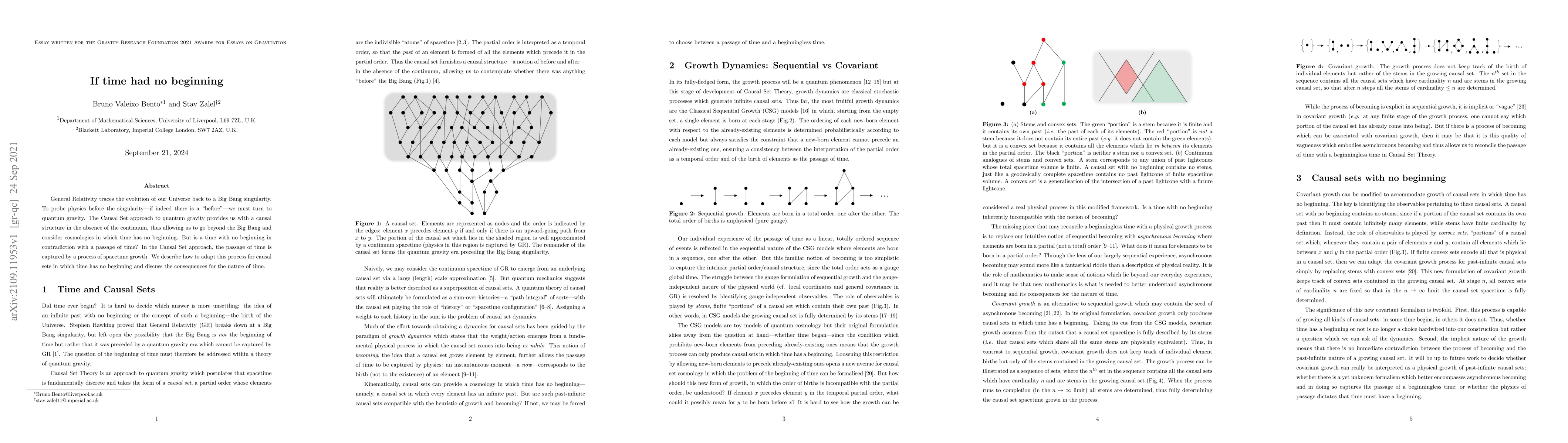 This paper explores the implications of a universe without a Big Bang, using the Causal Set approach to quantum gravity to propose a cosmology where time has no beginning. It discusses how the passage of time can be understood through spacetime growth in such models, thus addressing the nature of time beyond conventional beginnings.
