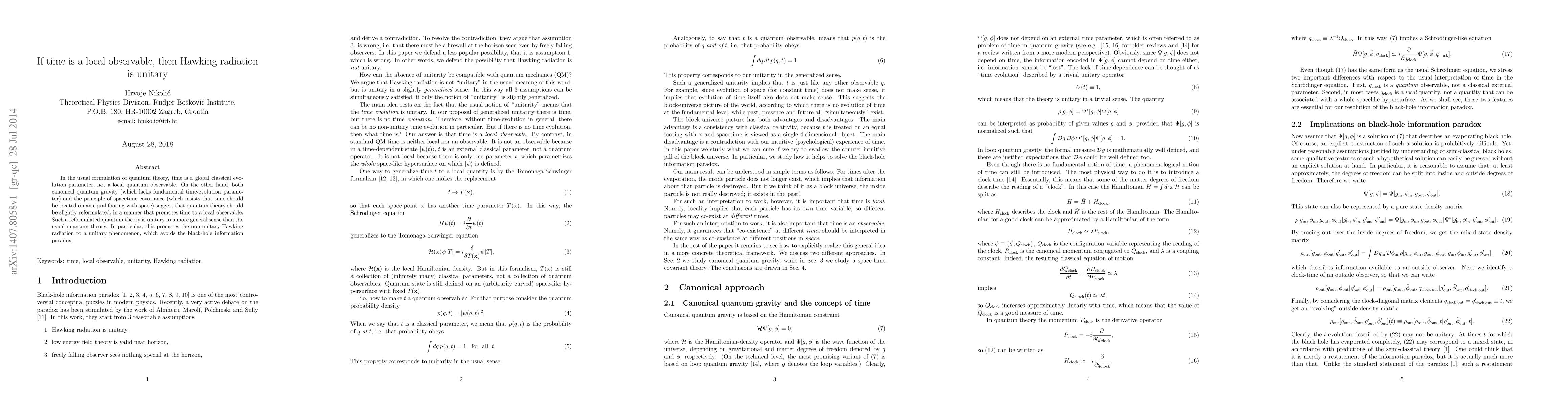 In the usual formulation of quantum theory, time is a global classical evolution parameter, not a local quantum observable. On the other hand, both canonical quantum gravity (which lacks fundamental time-evolution parameter) and the principle of spacetime covariance (which insists that time should be treated on an equal footing with space) suggest that quantum theory should be slightly reformulated, in a manner that promotes time to a local observable. Such a reformulated quantum theory is unitary in a more general sense than the usual quantum theory. In particular, this promotes the non-unitary Hawking radiation to a unitary phenomenon, which avoids the black-hole information paradox.