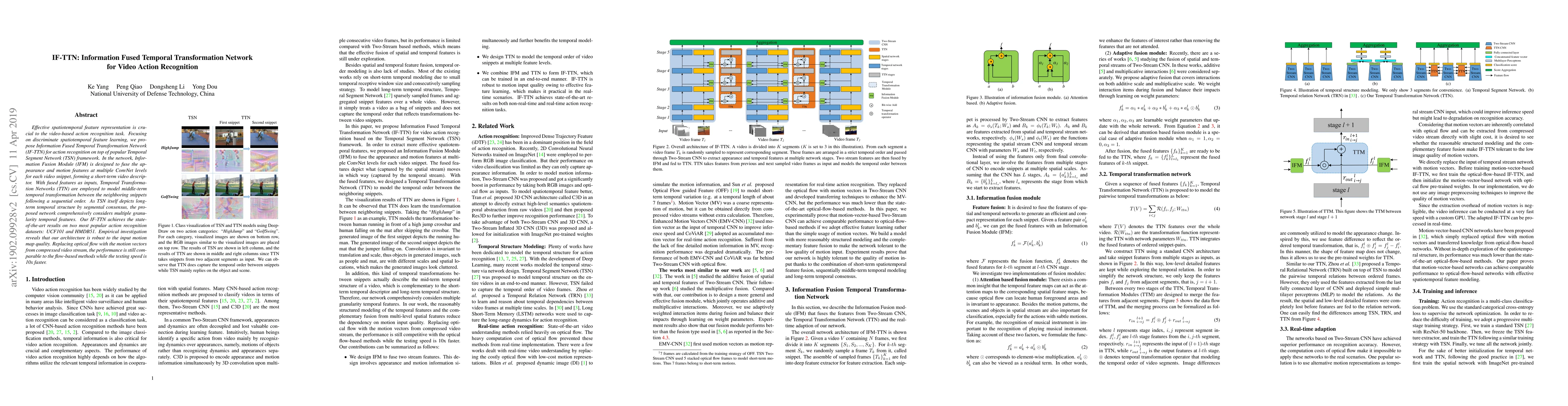 The IF-TTN network fuses appearance and motion features at multiple levels to create short-term video descriptors, which are then processed by Temporal Transformation Networks to model temporal transformations, achieving state-of-the-art results on UCF101 and HMDB51 datasets while remaining robust to variations in motion map quality.