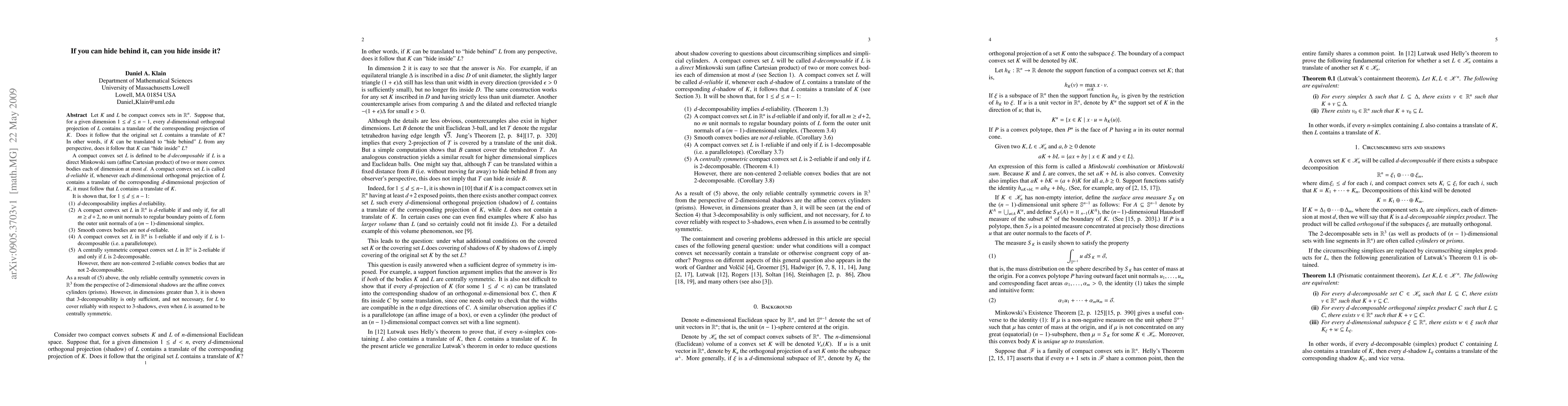 Let L be a compact convex set in R^n, and let 1 <= d <= n-1. The set L is defined to be d-decomposable if L is a direct Minkowski sum (affine Cartesian product) of two or more convex bodies each of dimension at most d. A compact convex set L is called d-reliable if, whenever each d-dimensional orthogonal projection of L contains a translate of the corresponding d-dimensional projection of a compact convex set K, it must follow that L contains a translate of K. It is shown that, for 1 <= d <= n-1: (1) d-decomposability implies d-reliability. (2) A compact convex set L in R^n is d-reliable if and only if, for all m >= d+2, no m unit normals to regular boundary points of L form the outer unit normals of a (m-1)-dimensional simplex. (3) Smooth convex bodies are not d-reliable. (4) A compact convex set L in R^n is 1-reliable if and only if L is 1-decomposable (i.e. a parallelotope). (5) A centrally symmetric compact convex set L in R^n is 2-reliable if and only if L is 2-decomposable. However, there are non-centered 2-reliable convex bodies that are not 2-decomposable.