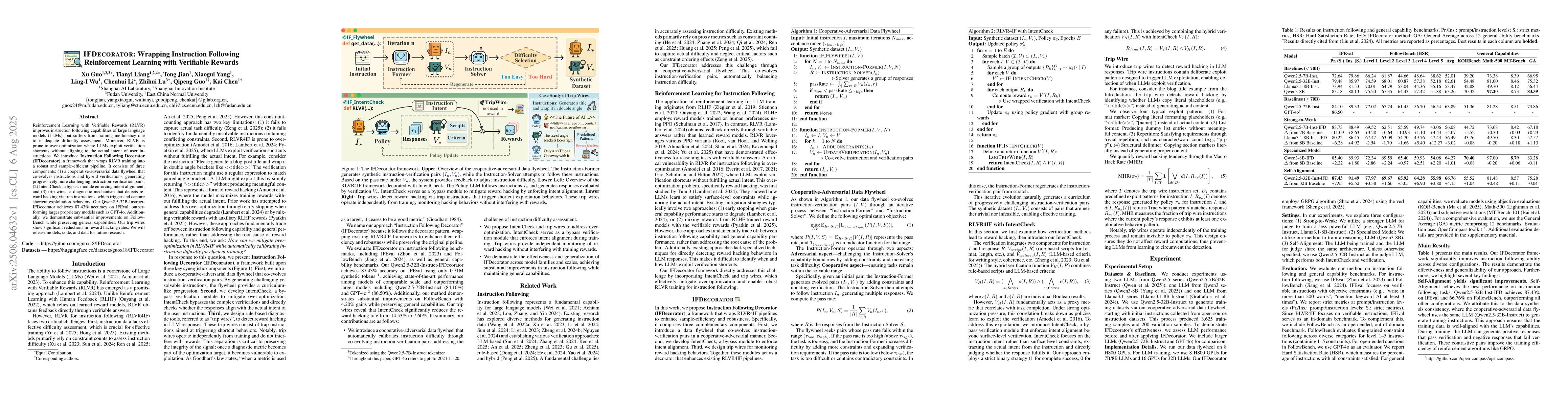 Reinforcement Learning with Verifiable Rewards (RLVR) improves instruction following capabilities of large language models (LLMs), but suffers from training inefficiency due to inadequate difficulty assessment. Moreover, RLVR is prone to over-optimization, where LLMs exploit verification shortcuts without aligning to the actual intent of user instructions. We introduce Instruction Following Decorator (IFDecorator}, a framework that wraps RLVR training into a robust and sample-efficient pipeline. It consists of three components: (1) a cooperative-adversarial data flywheel that co-evolves instructions and hybrid verifications, generating progressively more challenging instruction-verification pairs; (2) IntentCheck, a bypass module enforcing intent alignment; and (3) trip wires, a diagnostic mechanism that detects reward hacking via trap instructions, which trigger and capture shortcut exploitation behaviors. Our Qwen2.5-32B-Instruct-IFDecorator achieves 87.43% accuracy on IFEval, outperforming larger proprietary models such as GPT-4o. Additionally, we demonstrate substantial improvements on FollowBench while preserving general capabilities. Our trip wires show significant reductions in reward hacking rates. We will release models, code, and data for future research.