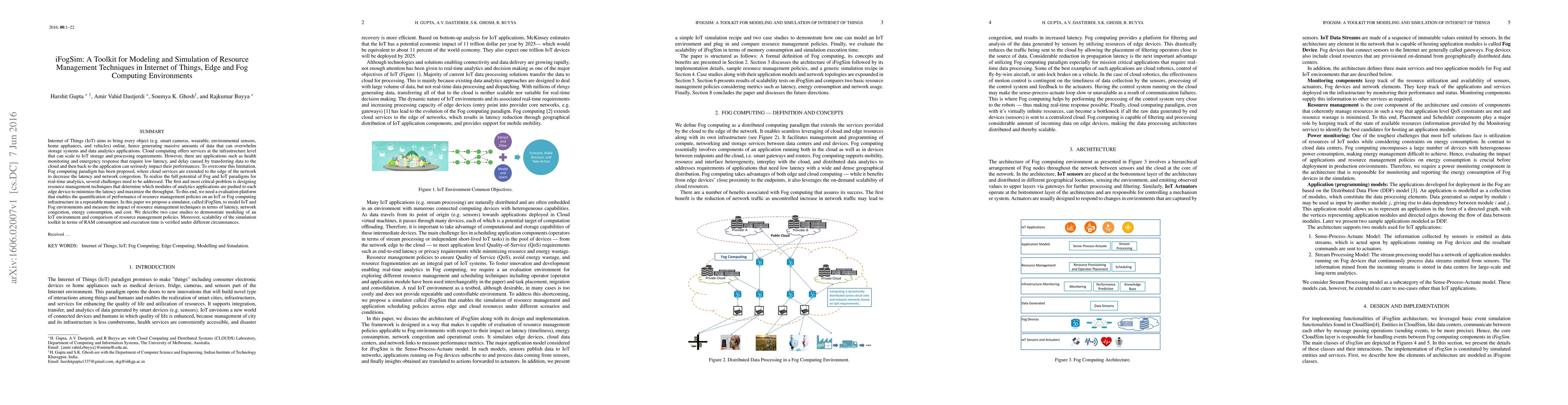 iFogSim is a simulator designed to model and evaluate resource management techniques in IoT and Fog computing environments, focusing on minimizing latency and maximizing throughput. It demonstrates scalability and effectiveness through two case studies and evaluates performance in terms of latency, network congestion, energy consumption, and cost.