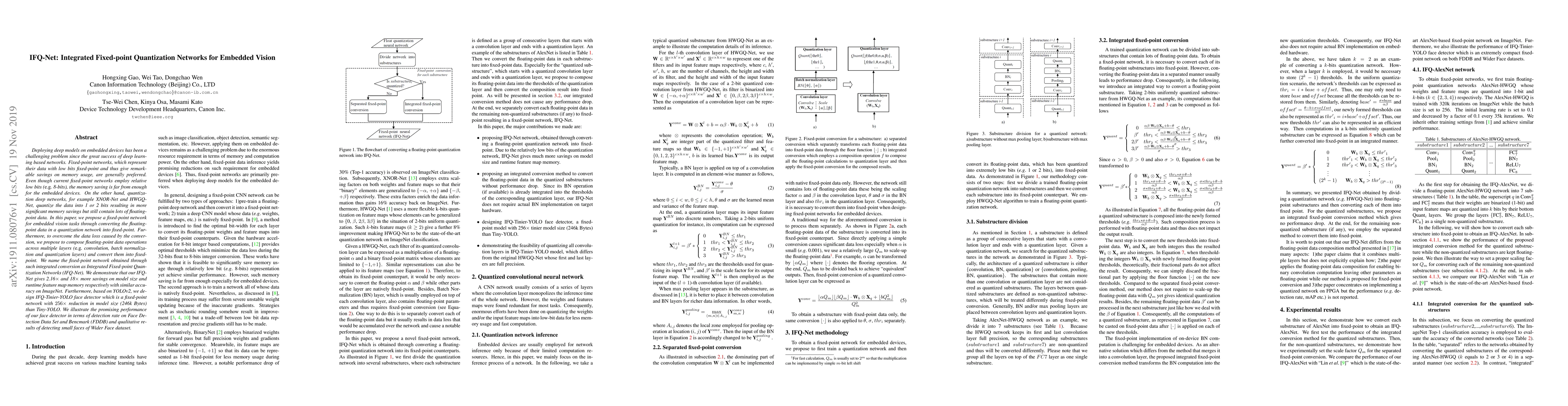 The paper proposes Integrated Fixed-point Quantization Networks (IFQ-Net) to enhance memory efficiency for embedded vision tasks by converting floating-point data in quantization networks into fixed-point. The method achieves significant model size and runtime memory savings while maintaining accuracy, demonstrated through applications like a 256x smaller face detector based on YOLOv2.