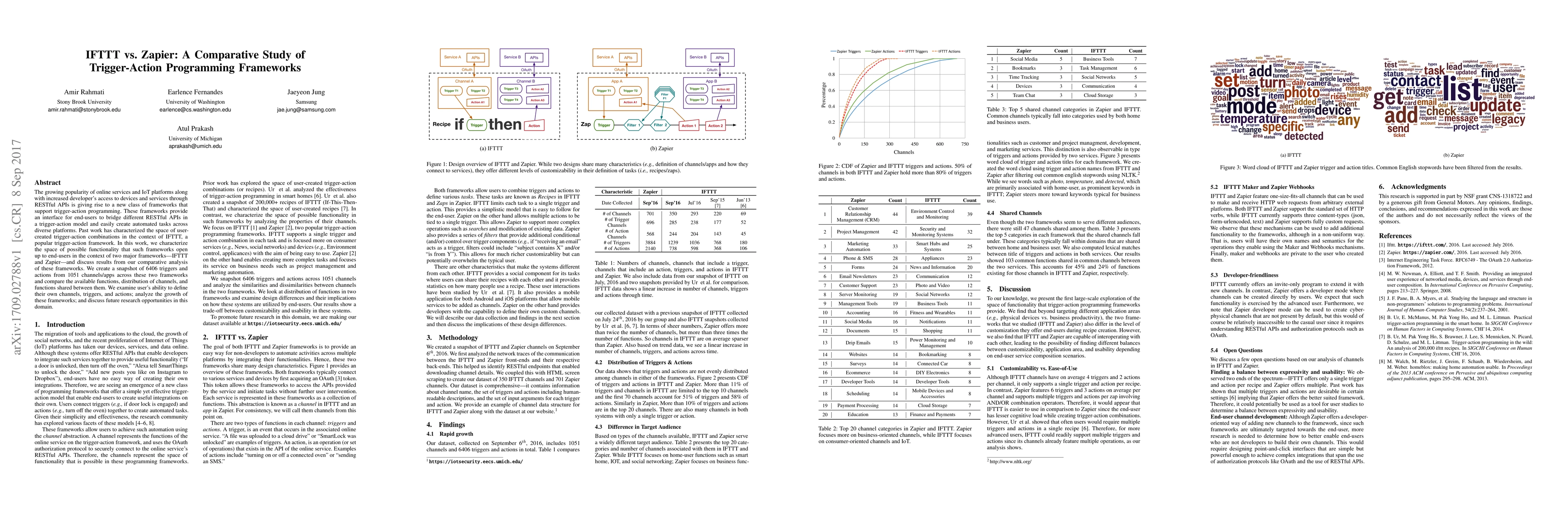 This paper compares IFTTT and Zapier, two trigger-action programming frameworks, analyzing their functionalities, distribution of channels, and shared features. The study provides insights into user-defined triggers and actions, growth trends, and future research directions in this domain.