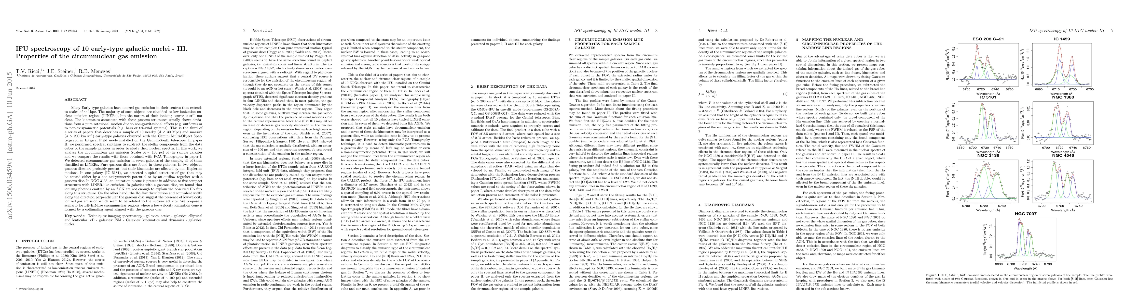 Many Early-type galaxies (ETG) have ionized gas emission in their centres that extends to scales of ~ 1kpc. The majority of such objects are classified as LINERs, but the nature of their ionizing source is still not clear. The kinematics associated with these gaseous structures usually shows deviations from a pure rotational motion due to non-gravitational effects or to non-axisymmetric potentials. This is the third of a series of papers that describes a sample of 10 nearby and massive ETG observed with the Gemini Multi-Object Spectrograph in Integral Field mode installed on the Gemini-South telescope. In paper II, we performed spectral synthesis to subtract the stellar components from the data cubes of the sample galaxies in order to study their nuclear spectra. Here, we analyse the circumnuclear gas emission (scales of ~ 100 pc) of the sample galaxies. Circumnuclear gas emission was detected in seven galaxies, all of them classified as LINERs. Pure gaseous discs are found in three galaxies. In two objects, gaseous discs are probably present, but their kinematics are affected by non-Keplerian motions. In IC 5181, we detected a spiral structure of gas that may be caused either by a non-axisymmetric potential or by an outflow together with a gaseous disc. In NGC 3136, an ionization bicone is present in addition to five compact structures with LINER-like emission. In galaxies with a gaseous disc, we found that ionizing photons emitted by an AGN are not enough to explain the observed Ha flux along this structure. On the other hand, the Ha flux distribution and equivalent width along the direction perpendicular the gaseous disc suggest the presence of low-velocity ionized gas emission which seem to be related to the nuclear activity. We propose a scenario for LINER-like circumnuclear regions where a low-velocity ionization cone is formed by a collimating agent aligned with the gaseous disc.