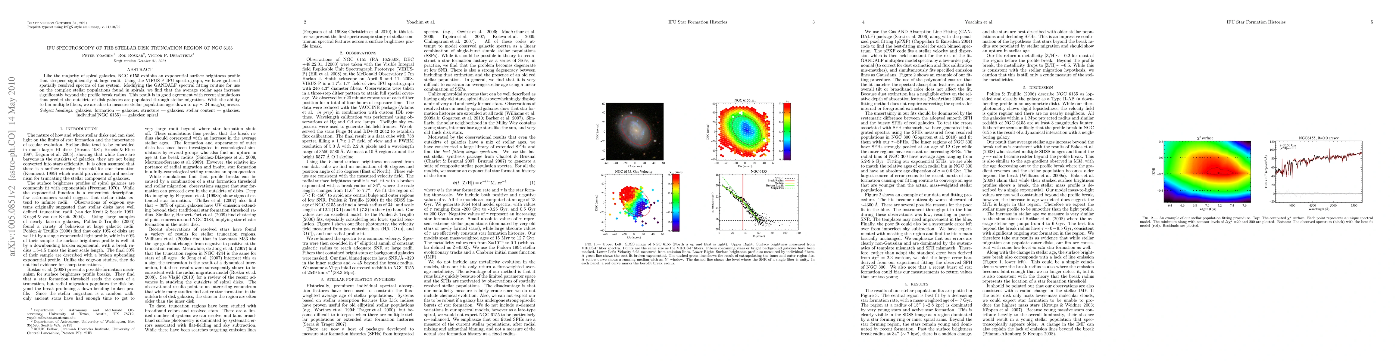 This study uses VIRUS-P IFU spectroscopy to analyze the stellar disk truncation region of NGC 6155, finding that average stellar ages increase significantly beyond the break radius. The results align with simulations suggesting that stellar migration populates the galaxy's outskirts.