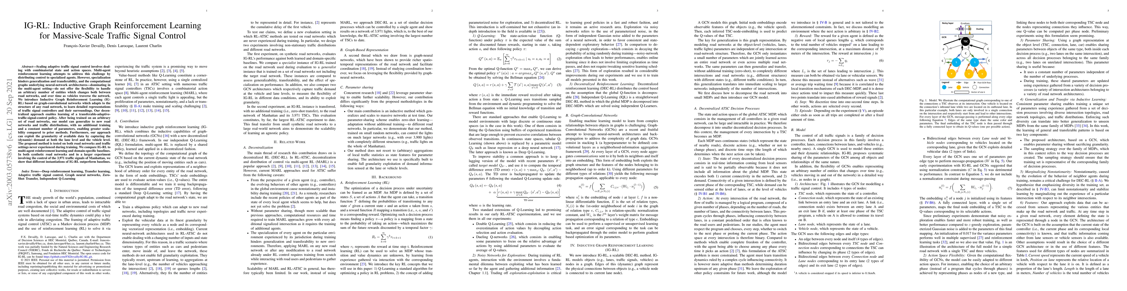 The paper introduces Inductive Graph Reinforcement Learning (IG-RL) for adaptive traffic-signal control, leveraging graph-convolutional networks to handle massive-scale traffic networks. IG-RL enables scalable, transferable policies that generalize to new road networks and traffic conditions without additional training, outperforming multi-agent reinforcement learning and domain-specific baselines.