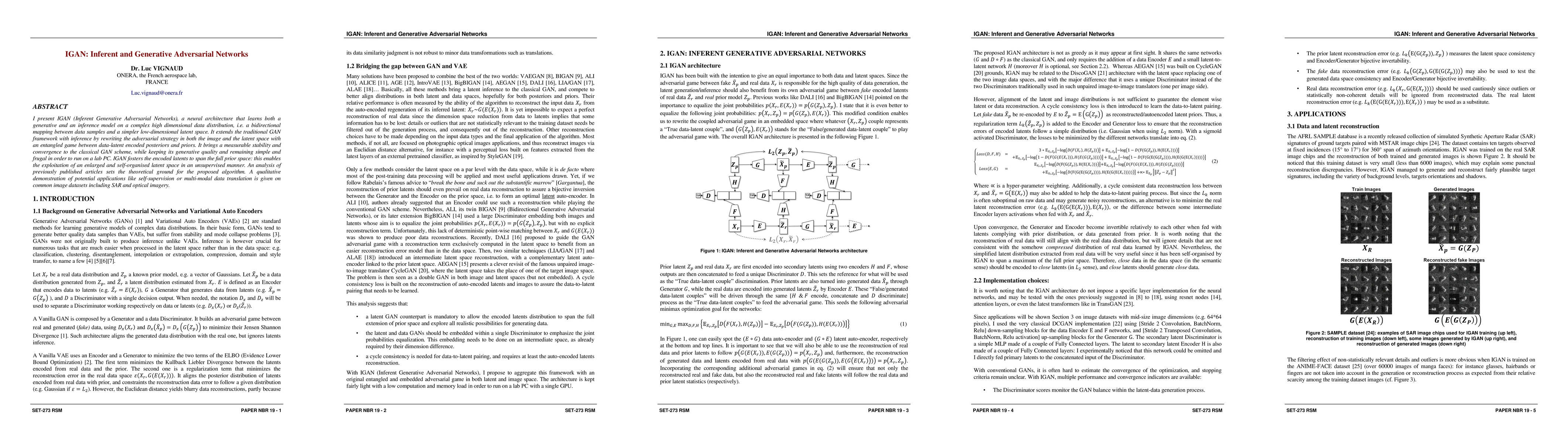 I present IGAN (Inferent Generative Adversarial Networks), a neural architecture that learns both a generative and an inference model on a complex high dimensional data distribution, i.e. a bidirectional mapping between data samples and a simpler low-dimensional latent space. It extends the traditional GAN framework with inference by rewriting the adversarial strategy in both the image and the latent space with an entangled game between data-latent encoded posteriors and priors. It brings a measurable stability and convergence to the classical GAN scheme, while keeping its generative quality and remaining simple and frugal in order to run on a lab PC. IGAN fosters the encoded latents to span the full prior space: this enables the exploitation of an enlarged and self-organised latent space in an unsupervised manner. An analysis of previously published articles sets the theoretical ground for the proposed algorithm. A qualitative demonstration of potential applications like self-supervision or multi-modal data translation is given on common image datasets including SAR and optical imagery.