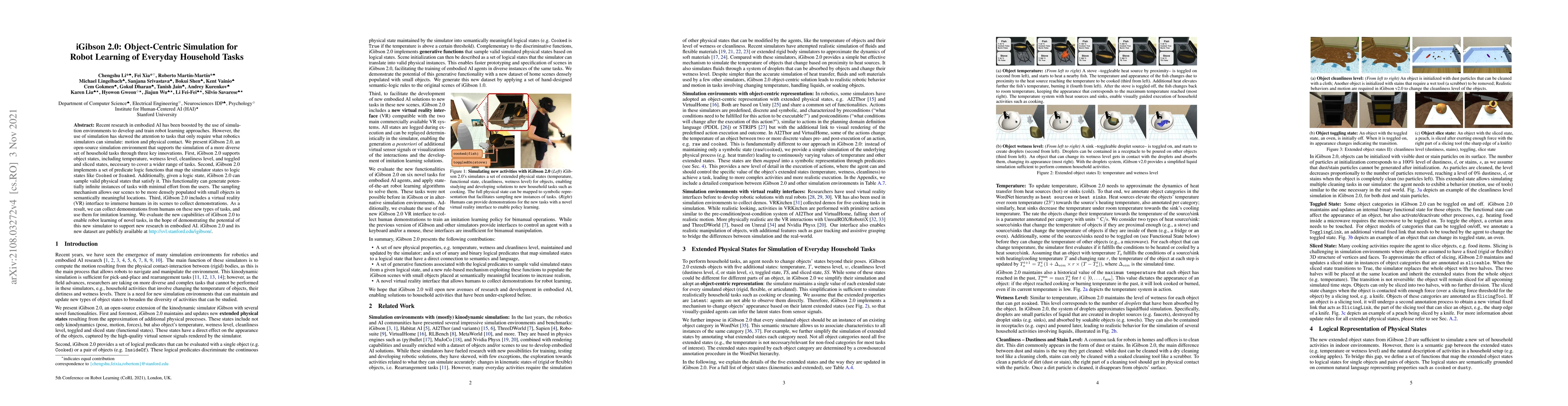 Recent research in embodied AI has been boosted by the use of simulation environments to develop and train robot learning approaches. However, the use of simulation has skewed the attention to tasks that only require what robotics simulators can simulate: motion and physical contact. We present iGibson 2.0, an open-source simulation environment that supports the simulation of a more diverse set of household tasks through three key innovations. First, iGibson 2.0 supports object states, including temperature, wetness level, cleanliness level, and toggled and sliced states, necessary to cover a wider range of tasks. Second, iGibson 2.0 implements a set of predicate logic functions that map the simulator states to logic states like Cooked or Soaked. Additionally, given a logic state, iGibson 2.0 can sample valid physical states that satisfy it. This functionality can generate potentially infinite instances of tasks with minimal effort from the users. The sampling mechanism allows our scenes to be more densely populated with small objects in semantically meaningful locations. Third, iGibson 2.0 includes a virtual reality (VR) interface to immerse humans in its scenes to collect demonstrations. As a result, we can collect demonstrations from humans on these new types of tasks, and use them for imitation learning. We evaluate the new capabilities of iGibson 2.0 to enable robot learning of novel tasks, in the hope of demonstrating the potential of this new simulator to support new research in embodied AI. iGibson 2.0 and its new dataset are publicly available at http://svl.stanford.edu/igibson/.