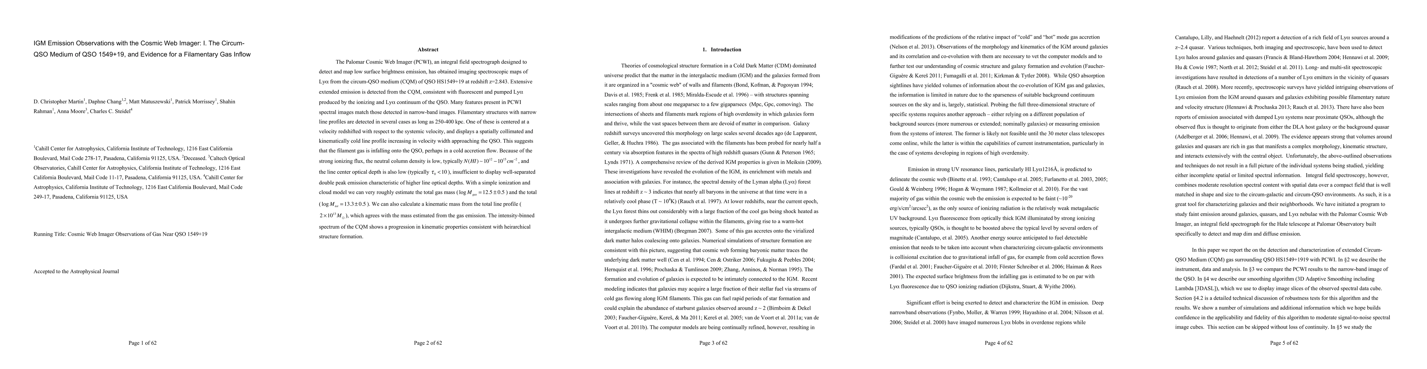 The Palomar Cosmic Web Imager (PCWI), an integral field spectrograph designed to detect and map low surface brightness emission, has obtained imaging spectroscopic maps of Ly-alpha from the circum-QSO medium (CQM) of QSO HS1549+19 at redshift of 2.843. Extensive extended emission is detected from the CQM, consistent with fluorescent and pumped Ly-alpha produced by the ionizing and Ly-alpha continuum of the QSO. Many features present in PCWI spectral images match those detected in narrow-band images. Filamentary structures with narrow line profiles are detected in several cases as long as 250-400 kpc. One of these is centered at a velocity redshifted with respect to the systemic velocity, and displays a spatially collimated and kinematically cold line profile increasing in velocity width approaching the QSO. This suggests that the filament gas is infalling onto the QSO, perhaps in a cold accretion flow. Because of the strong ionizing flux, the neutral column density is low, typically N(HI) is roughly 10E12-10E15/square-cm, and the line center optical depth is also low (typically tau0 is less than 10), insufficient to display well-separated double peak emission characteristic of higher line optical depths. With a simple ionization and cloud model we can very roughly estimate the total gas mass (log M(gas) equal to 12.5 +/- 0.5) and the total mass (log M(tot) equal to 13.3+/- 0.5). We can also calculate a kinematic mass from the total line profile (2x10E13 M(sun)), which agrees with the mass estimated from the gas emission. The intensity-binned spectrum of the CQM shows a progression in kinematic properties consistent with heirarchical structure formation.