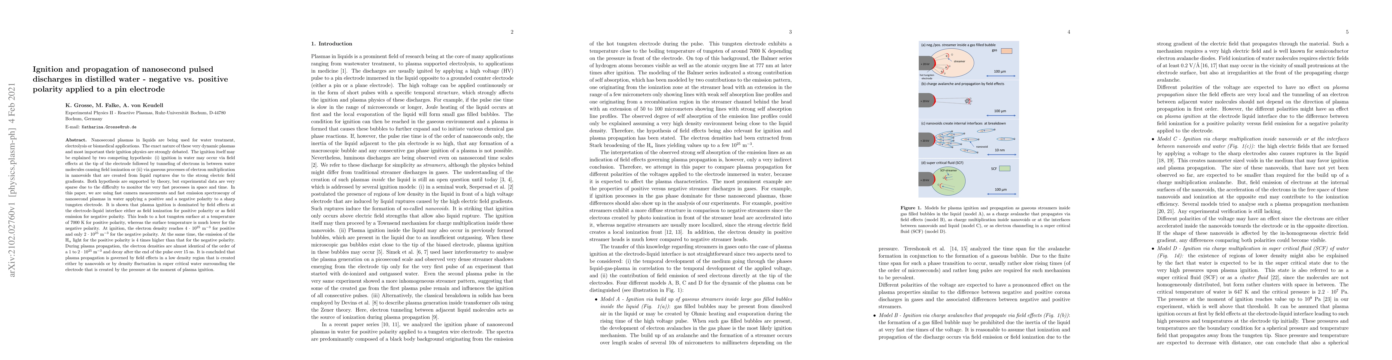 This paper investigates the ignition and propagation of nanosecond pulsed discharges in distilled water under positive and negative electrode polarities. It finds that plasma ignition is dominated by field effects at the electrode-liquid interface, leading to significantly higher electron densities and emission for positive polarity compared to negative polarity.