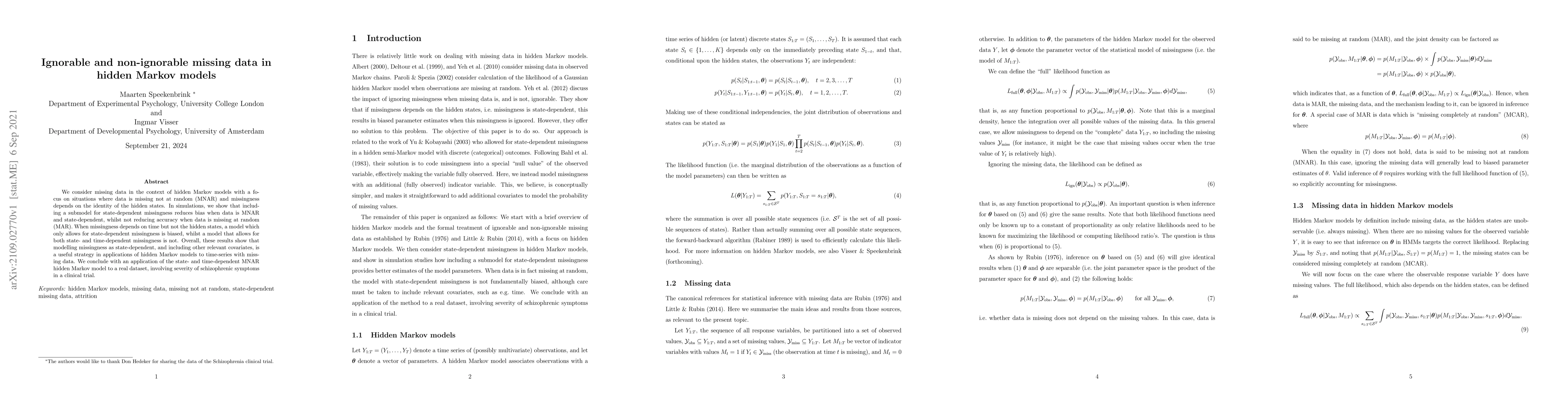 This paper investigates hidden Markov models with missing data, distinguishing between ignorable and non-ignorable missingness. It demonstrates that incorporating a submodel for state-dependent missingness effectively reduces bias in non-ignorable cases, while maintaining accuracy for ignorable cases, and proposes a combined state- and time-dependent model for comprehensive handling.