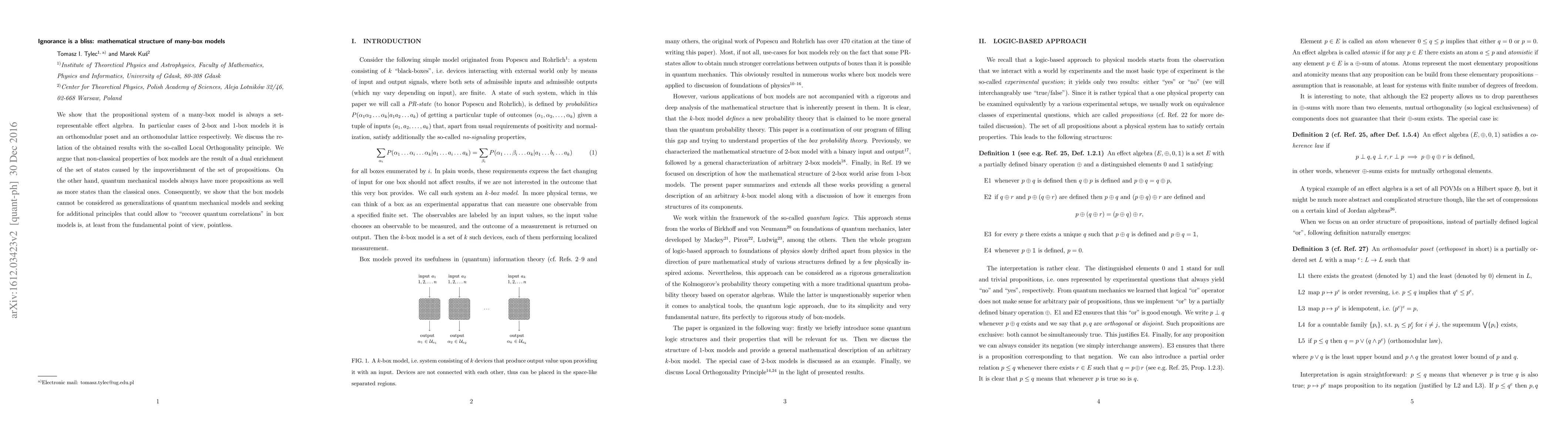 We show that the propositional system of a many-box model is always a set-representable effect algebra. In particular cases of 2-box and 1-box models it is an orthomodular poset and an orthomodular lattice respectively. We discuss the relation of the obtained results with the so-called Local Orthogonality principle. We argue that non-classical properties of box models are the result of a dual enrichment of the set of states caused by the impoverishment of the set of propositions. On the other hand, quantum mechanical models always have more propositions as well as more states than the classical ones. Consequently, we show that the box models cannot be considered as generalizations of quantum mechanical models and seeking for additional principles that could allow to "recover quantum correlations" in box models is, at least from the fundamental point of view, pointless.
