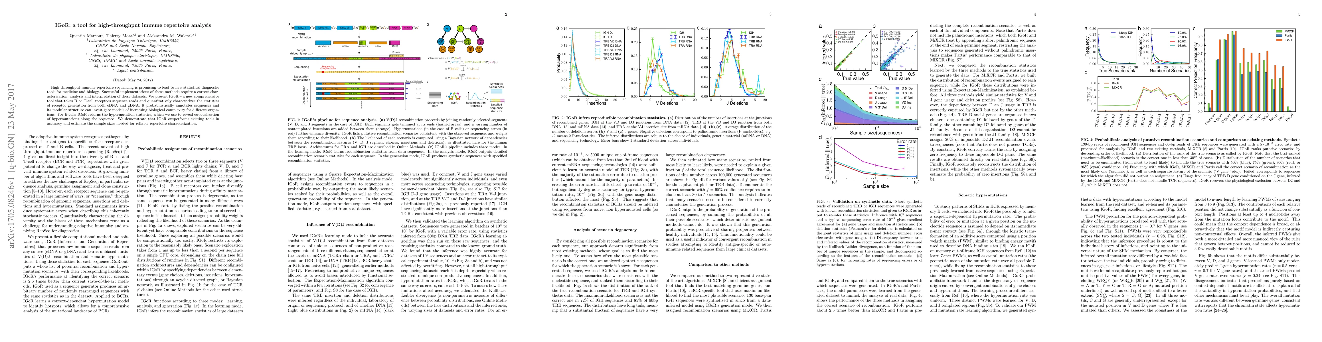 IGoR is a new tool for high-throughput immune repertoire analysis that characterizes B and T-cell receptor sequences, probabilistically annotates them, and reveals hypermutation statistics. It outperforms existing tools in accuracy and estimates sample sizes for reliable repertoire characterization.