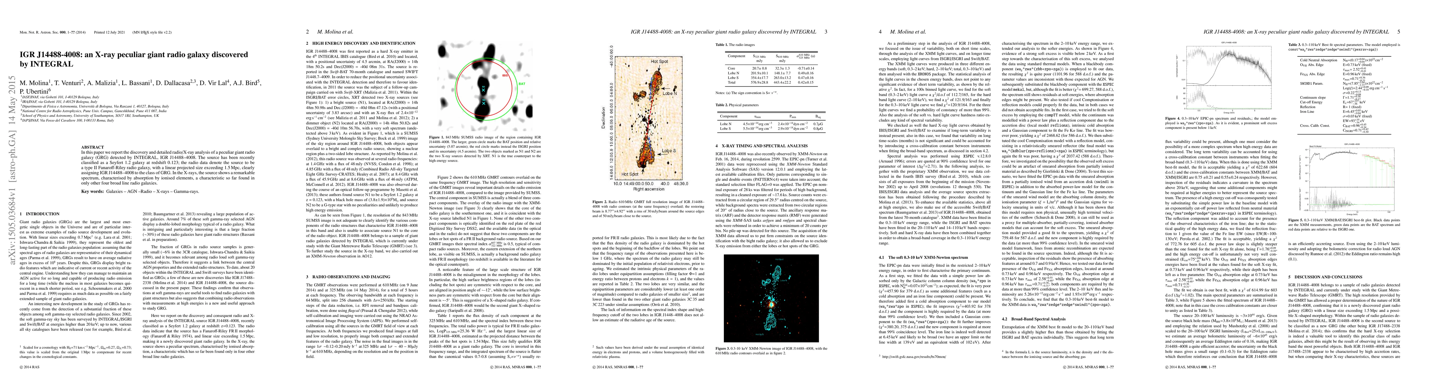 In this paper we report the discovery and detailed radio/X-ray analysis of a peculiar giant radio galaxy (GRG) detected by INTEGRAL, IGR J14488-4008. The source has been recently classified as a Seyfert 1.2 galaxy at redshift 0.123; the radio data denote the source to be a type II Fanaroff-Riley radio galaxy, with a linear projected size exceeding 1.5 Mpc, clearly assigning IGR J14488-4008 to the class of GRG. In the X-rays, the source shows a remarkable spectrum, characterised by absorption by ionised elements, a characteristic so far found in only other four broad line radio galaxies.