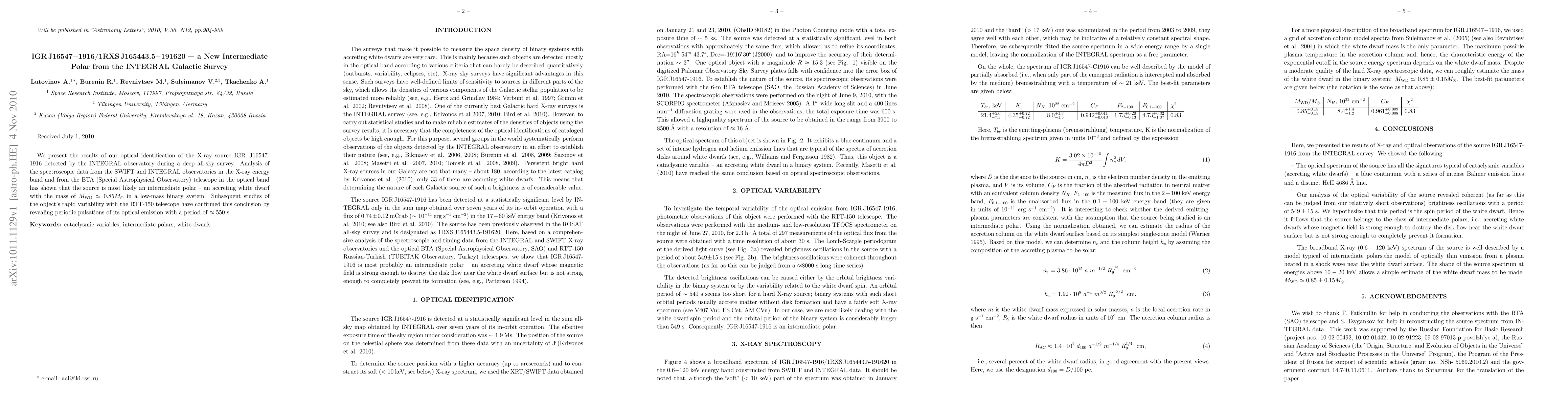 The research identifies IGR J16547-1916 as a new intermediate polar, an accreting white dwarf with a mass of approximately 0.85 solar masses, using data from INTEGRAL, SWIFT, BTA, and RTT-150 telescopes. The study reveals periodic optical pulsations with a period of ~550 seconds, confirming its intermediate polar nature.