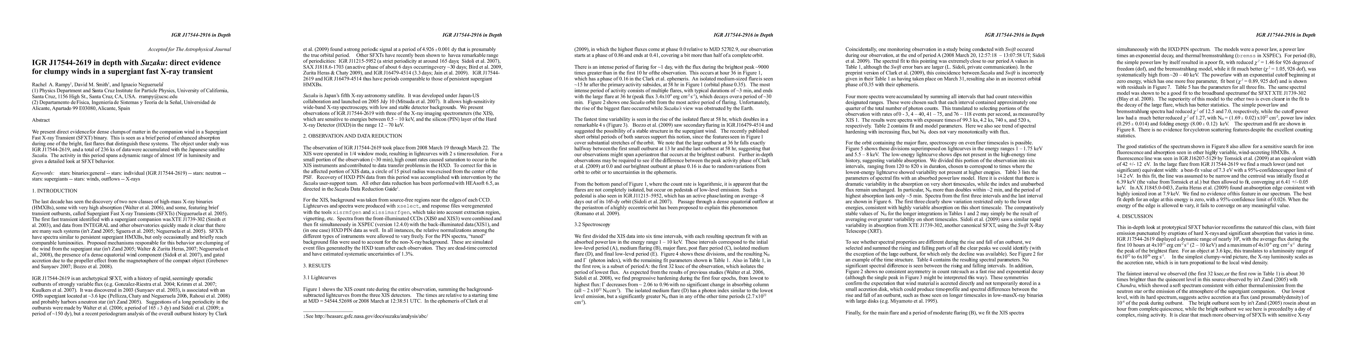 We present the first direct evidence for dense clumps of matter in the companion wind in a Supergiant Fast X-ray Transient (SFXT) binary. This is seen as a brief period of enhanced absorption during one of the bright, fast flares that distinguish these systems. The object under study was IGR J17544-2619, and a total of 236 ks of data were accumulated with the Japanese satellite Suzaku. The activity in this period spans a dynamic range of almost 10000 in luminosity and gives a detailed look at SFXT behavior.
