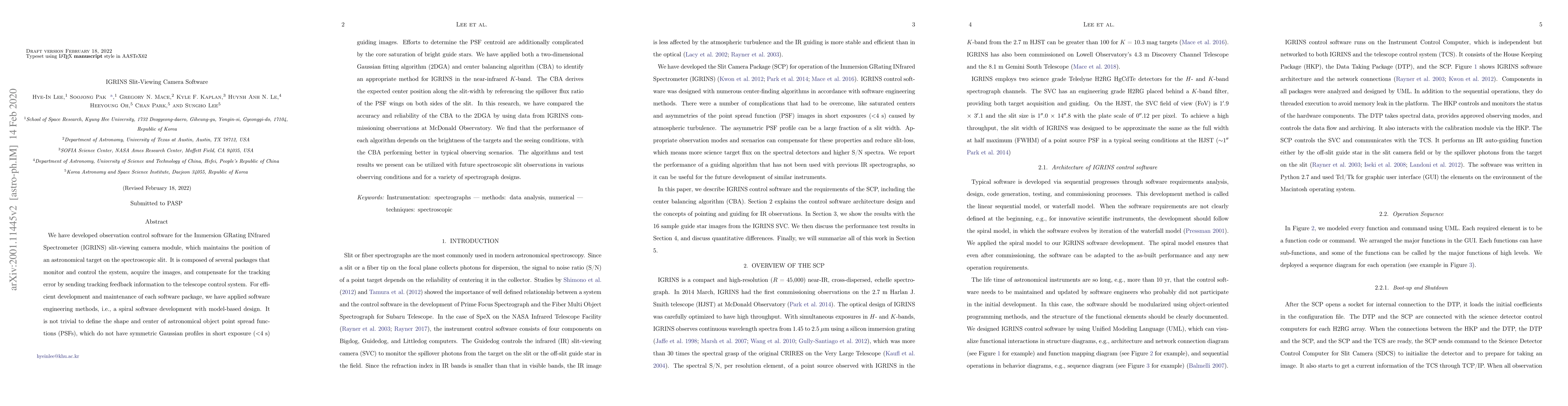 The paper presents software developed to control the IGRINS slit-viewing camera, focusing on maintaining target positioning and tracking errors. It compares the accuracy of two algorithms—2DGA and CBA—to determine the best method for centroid tracking in near-infrared K-band observations, finding CBA more reliable in typical conditions.