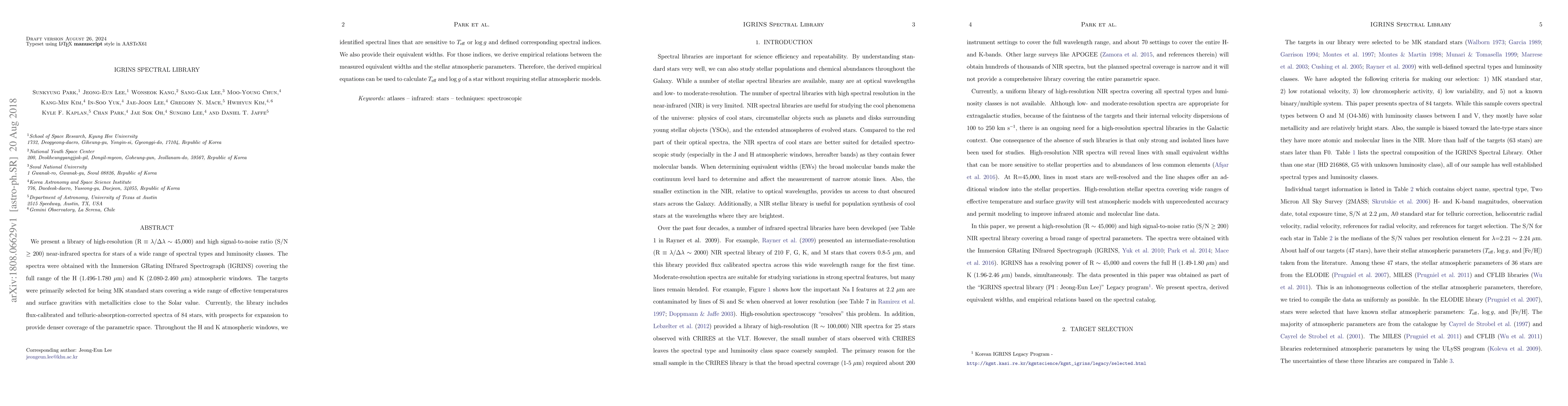 The IGRINS Spectral Library presents high-resolution near-infrared spectra of 84 MK standard stars, obtained with IGRINS, covering the H and K atmospheric windows. The library includes empirical relations for calculating stellar effective temperatures and surface gravities without atmospheric models.