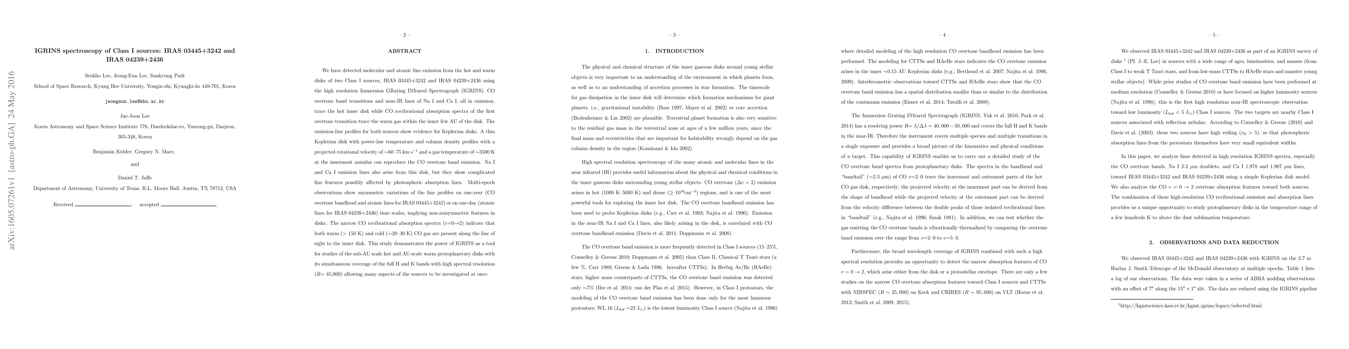 The study used the IGRINS spectrograph to detect emission lines from hot and warm disks of Class I sources IRAS 03445+3242 and IRAS 04239+2436. The data revealed Keplerian disk structures, gas temperatures around 3500K, and the presence of both warm and cold CO gas. Multi-epoch observations showed asymmetric variations in line profiles, suggesting non-axisymmetric disk features. IGRINS' high resolution and full H and K bands coverage proved effective for examining these sub-AU and AU scale protoplanetary disks.