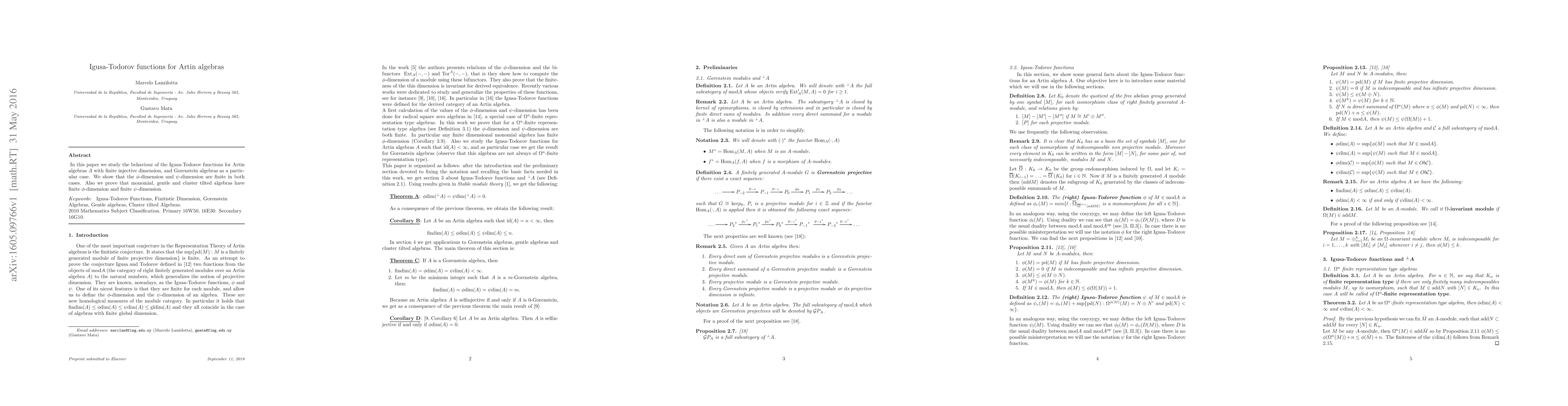 This paper investigates the Igusa-Todorov functions for Artin algebras with finite injective dimension, demonstrating that both $\phi$-dimension and $\psi$-dimension are finite. It also proves that monomial, gentle, and cluster tilted algebras exhibit finite $\phi$-dimension and $\psi$-dimension.