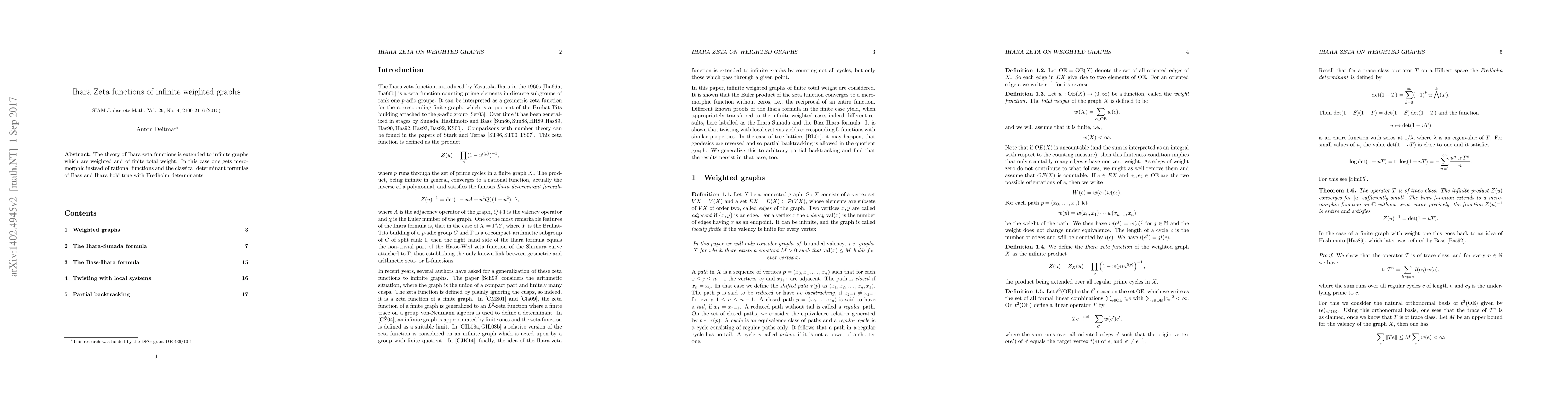 Summary: This paper extends Ihara zeta functions to infinite weighted graphs with finite total weight, resulting in meromorphic functions, and verifies the classical determinant formulas using Fredholm determinants.