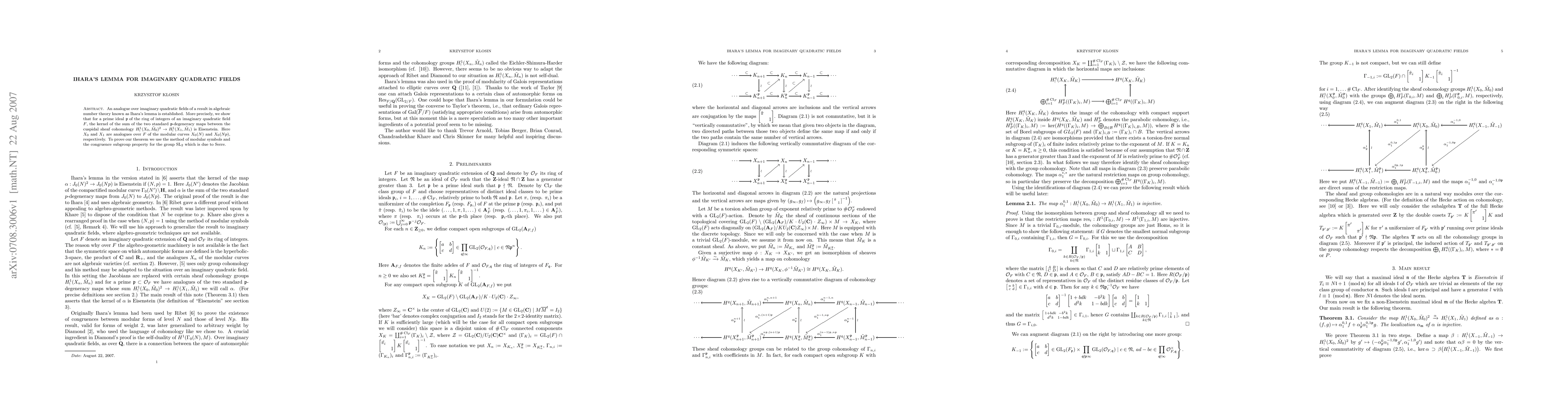 An analogue over imaginary quadratic fields of a result in algebraic number theory known as Ihara's lemma is established. More precisely, we show that for a prime ideal P of the ring of integers of an imaginary quadratic field F, the kernel of the sum of the two standard P-degeneracy maps between the cuspidal sheaf cohomology H^1_!(X_0, M_0)^2 --> H^1_!(X_1, M_1) is Eisenstein. Here X_0 and X_1 are analogues over F of the modular curves X_0(N) and X_0(Np), respectively. To prove our theorem we use the method of modular symbols and the congruence subgroup property for the group SL(2) which is due to Serre.