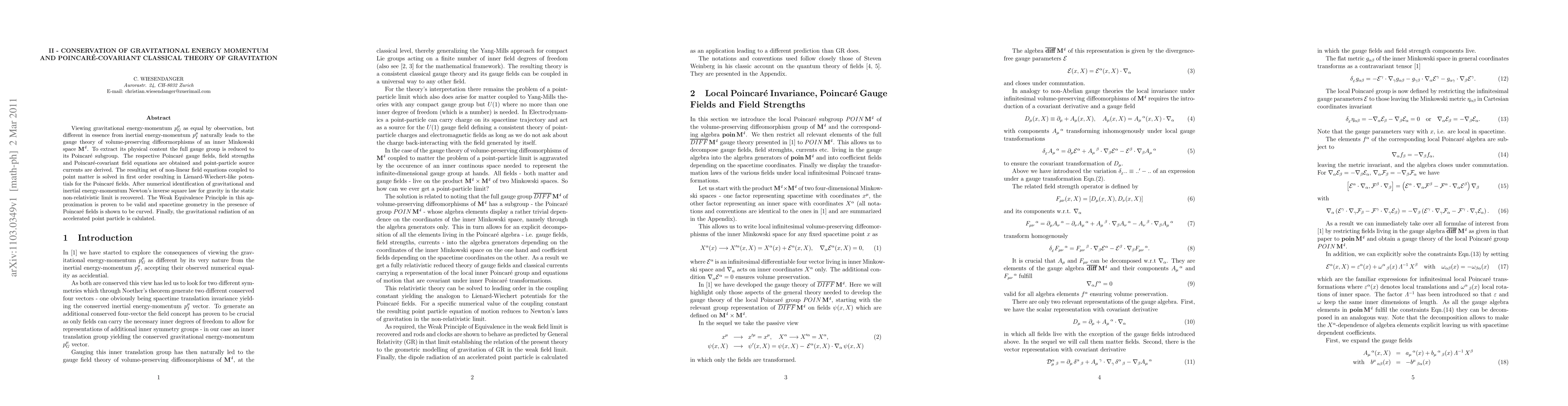 Viewing gravitational energy-momentum $p_G^\mu$ as equal by observation, but different in essence from inertial energy-momentum $p_I^\mu$ naturally leads to the gauge theory of volume-preserving diffeormorphisms of an inner Minkowski space ${\bf M}^{\sl 4}$. To extract its physical content the full gauge group is reduced to its Poincar\'e subgroup. The respective Poincar\'e gauge fields, field strengths and Poincar\'e-covariant field equations are obtained and point-particle source currents are derived. The resulting set of non-linear field equations coupled to point matter is solved in first order resulting in Lienard-Wiechert-like potentials for the Poincar\'e fields. After numerical identification of gravitational and inertial energy-momentum Newton's inverse square law for gravity in the static non-relativistic limit is recovered. The Weak Equivalence Principle in this approximation is proven to be valid and spacetime geometry in the presence of Poincar\'e fields is shown to be curved. Finally, the gravitational radiation of an accelerated point particle is calulated.