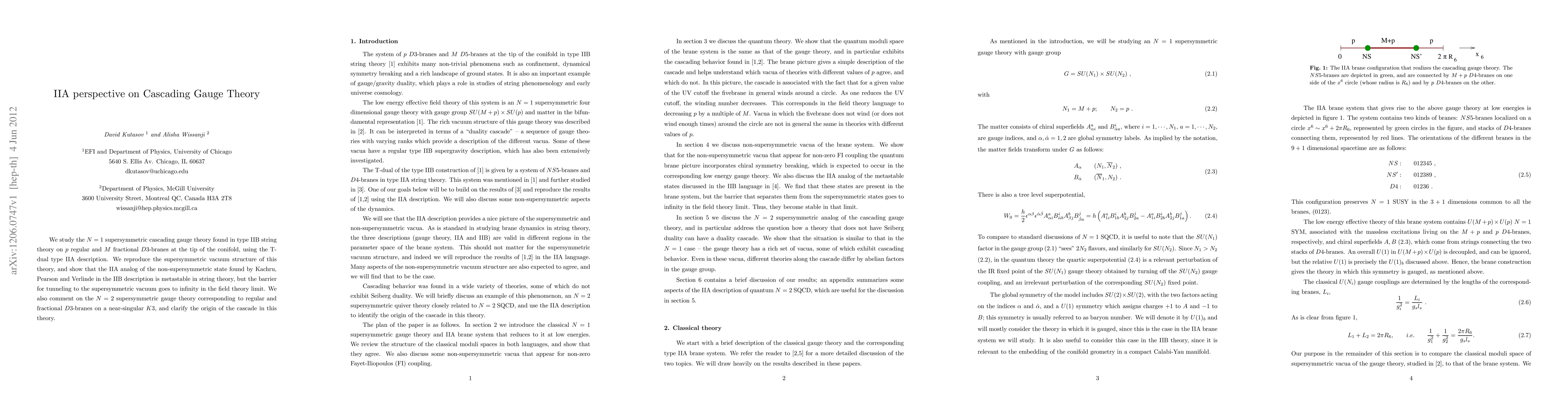 This paper investigates the N=1 supersymmetric cascading gauge theory in type IIB string theory using the T-dual type IIA description, revealing the metastability of a non-supersymmetric state and the infinite barrier for tunneling to the supersymmetric vacuum in the field theory limit. It also discusses the N=2 supersymmetric gauge theory related to D3-branes on a near-singular K3 and clarifies the origin of the cascade.