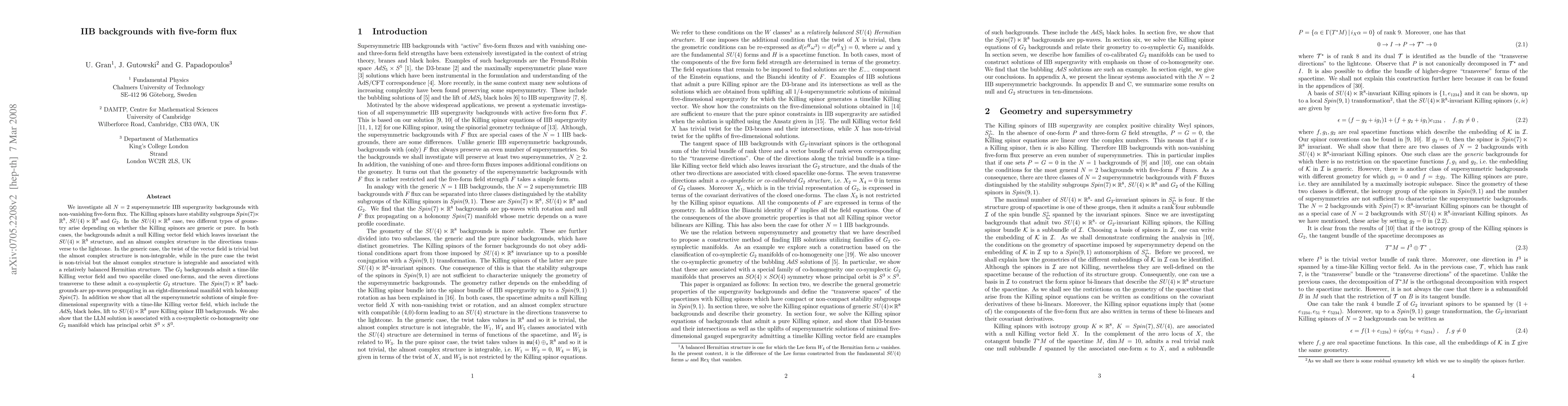 This research explores N=2 supersymmetric IIB supergravity backgrounds with five-form flux, identifying three cases: $Spin(7)ltimesR^8$, $SU(4)ltimesR^8$, and $G_2$. It reveals distinct geometric properties for each, including null Killing vectors, almost complex structures, and co-symplectic $G_2$ structures. The study also links five-dimensional supergravity solutions to IIB backgrounds and identifies the LLM solution with a co-symplectic co-homogeneity one $G_2$ manifold.
