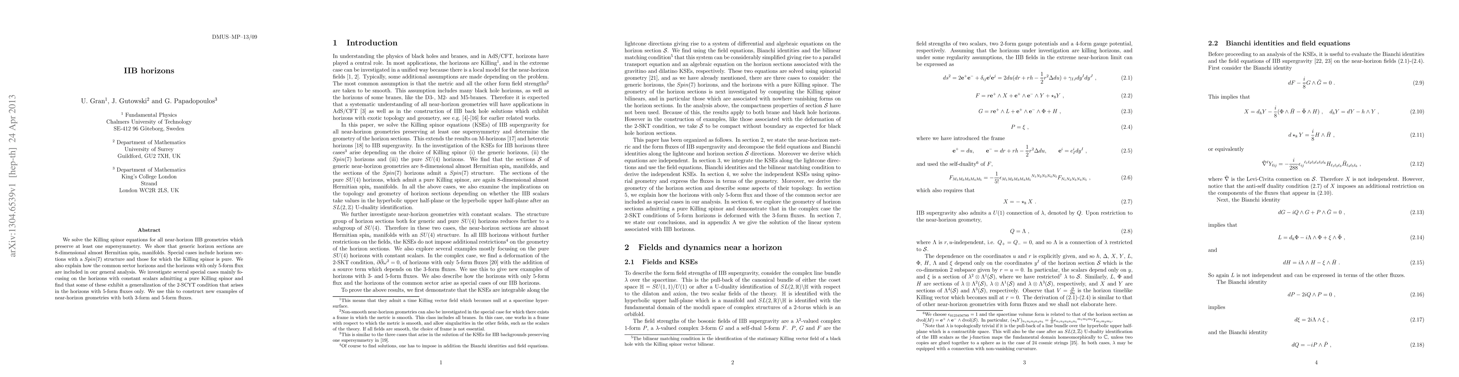 Researchers solved the Killing spinor equations for near-horizon IIB geometries, finding that some horizon sections exhibit a generalization of a 2-SCYT condition and can be used to construct new examples of near-horizon geometries with specific fluxes.