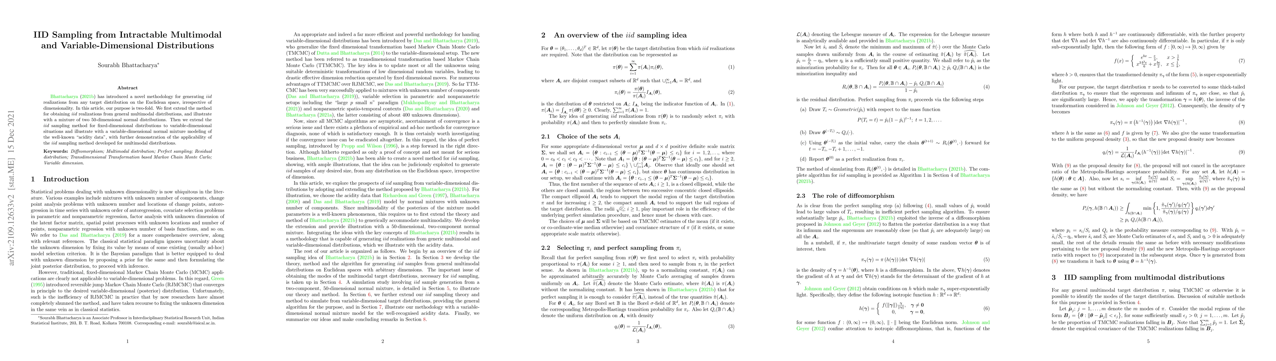 This paper extends Bhattacharya's novel iid sampling methodology to handle multimodal and variable-dimensional distributions, demonstrating its application through a mixture of high-dimensional normal distributions and a variable-dimensional normal mixture model for acidity data.