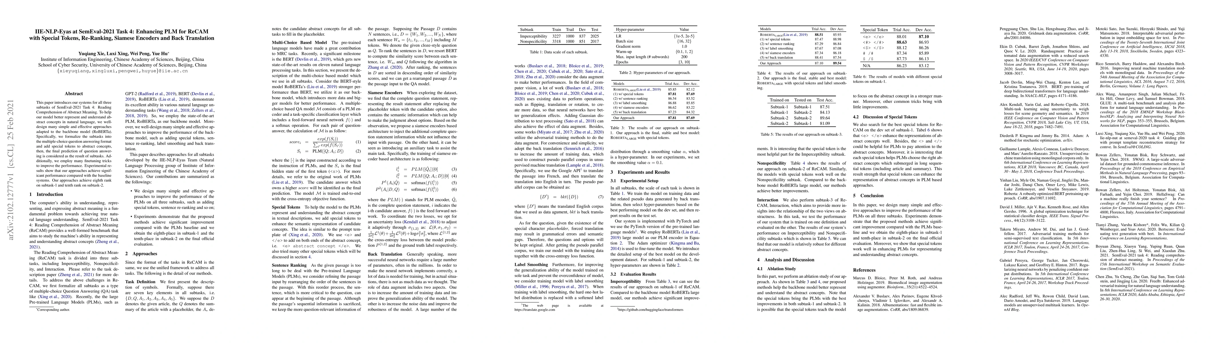This paper introduces our systems for all three subtasks of SemEval-2021 Task 4: Reading Comprehension of Abstract Meaning. To help our model better represent and understand abstract concepts in natural language, we well-design many simple and effective approaches adapted to the backbone model (RoBERTa). Specifically, we formalize the subtasks into the multiple-choice question answering format and add special tokens to abstract concepts, then, the final prediction of question answering is considered as the result of subtasks. Additionally, we employ many finetuning tricks to improve the performance. Experimental results show that our approaches achieve significant performance compared with the baseline systems. Our approaches achieve eighth rank on subtask-1 and tenth rank on subtask-2.