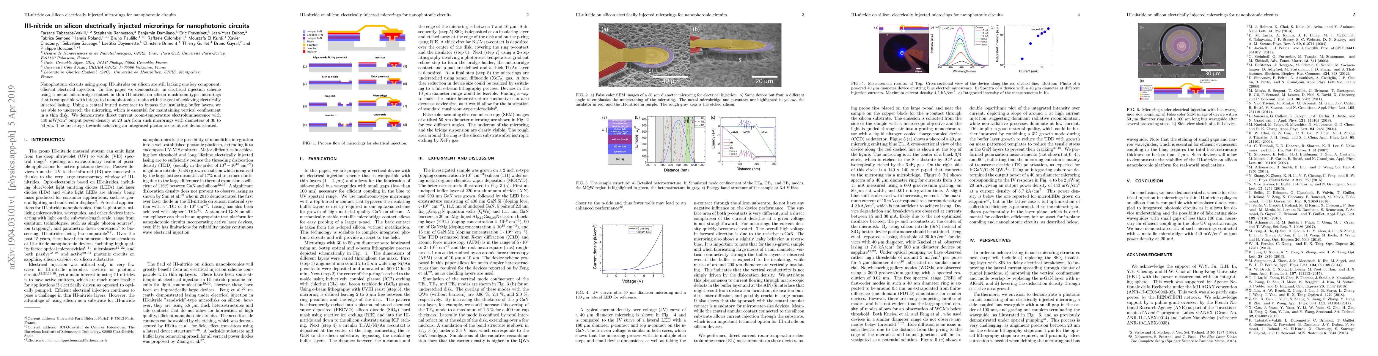 This paper presents a method for efficient electrical injection in III-nitride on silicon microrings via a metal microbridge contact, enabling room-temperature electroluminescence with 440 mW/cm² output power density. The approach uses a buried n-contact to maintain vertical confinement and is a step towards integrated nanophotonic circuits.