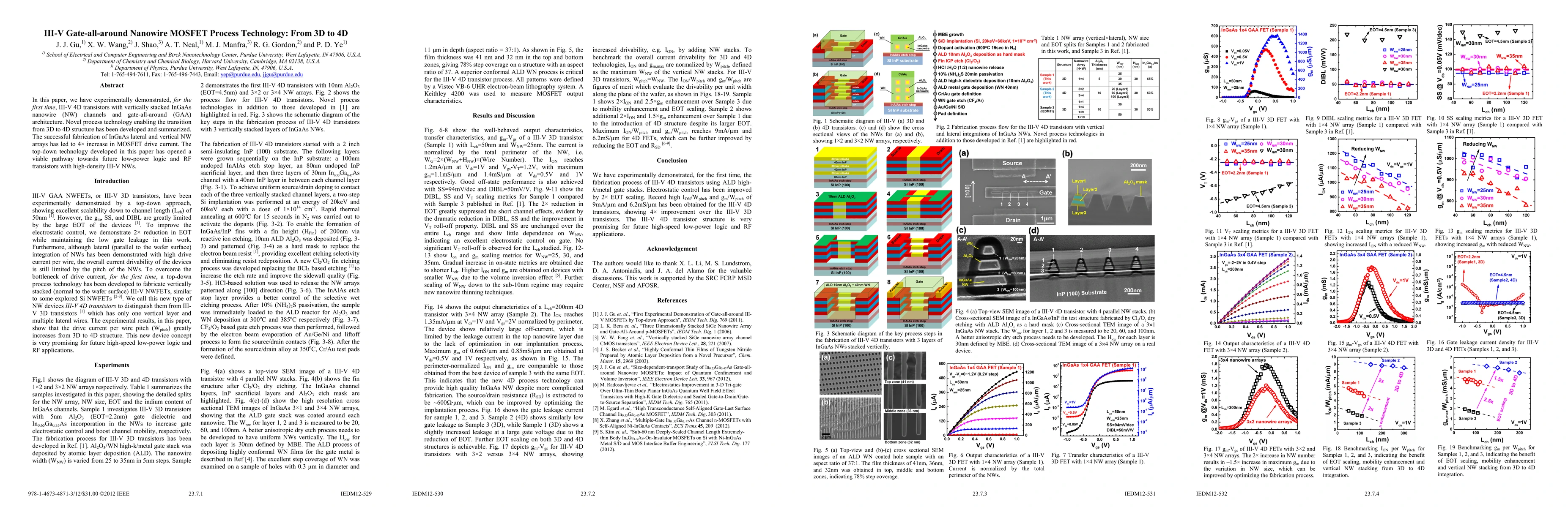 This paper demonstrates the first experimental realization of III-V 4D transistors using vertically stacked InGaAs nanowire channels and gate-all-around architecture, achieving a 4x increase in MOSFET drive current. The novel process technology developed enables the transition from 3D to 4D structures, paving the way for future low-power logic and RF transistors.