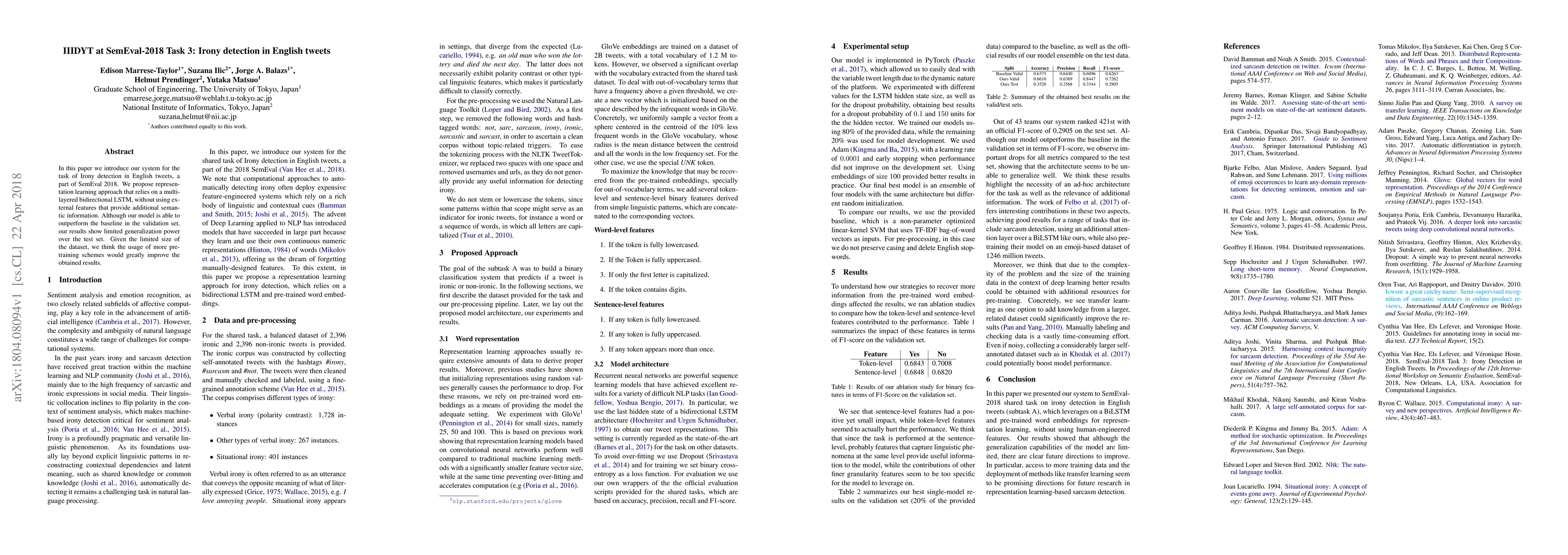 Summary: This paper presents a system for detecting irony in English tweets using a multi-layered bidirectional LSTM for representation learning, showing improved performance over baselines but limited generalization, suggesting that pre-training could enhance results given the dataset's size.