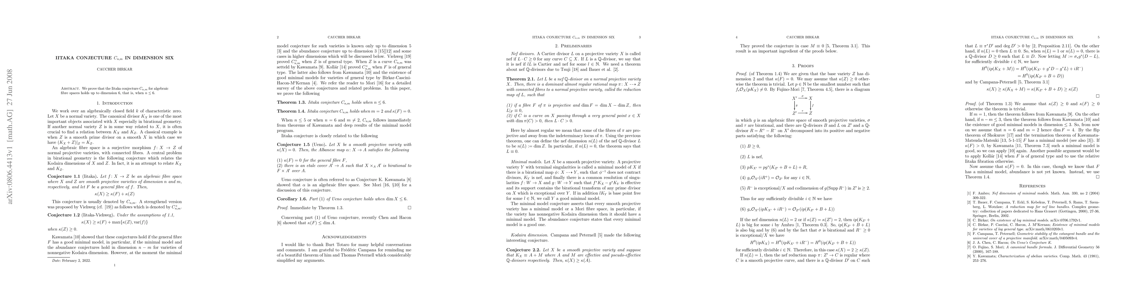 Summary: This paper proves the Iitaka conjecture $C_{n,m}$ for algebraic fibre spaces up to dimension six, confirming its validity for $n \le 6$. The result extends our understanding of the conjecture's applicability in higher-dimensional algebraic geometry.