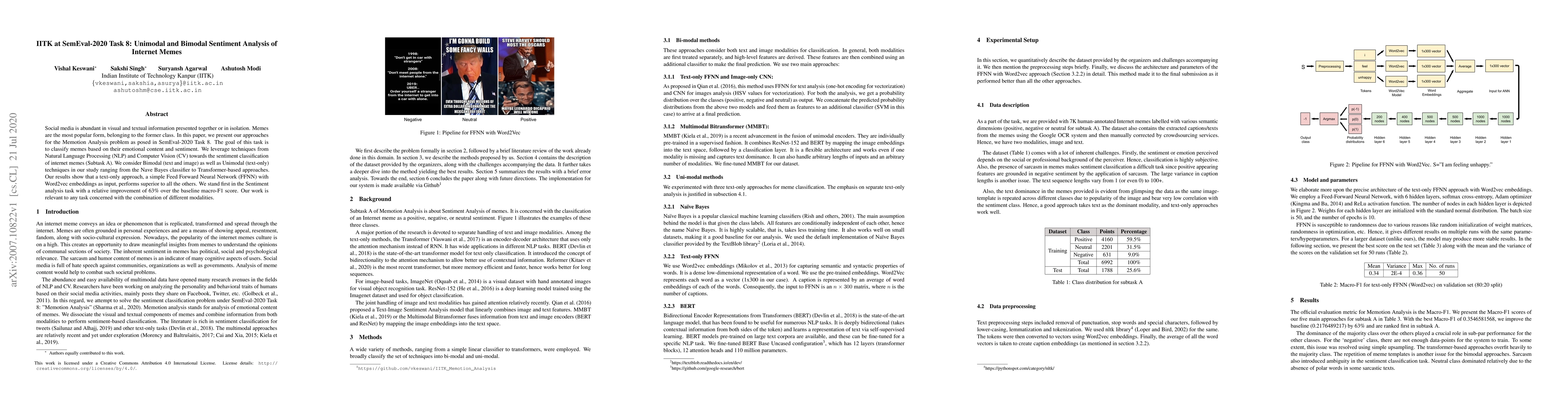 IITK's research on SemEval-2020 Task 8 employs NLP and CV techniques for internet meme sentiment analysis, achieving top results with a text-only FFNN model, demonstrating a 63% improvement over the baseline. This study highlights the effectiveness of unimodal approaches over bimodal methods for this specific task.
